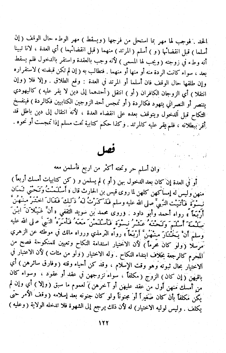 فَصْلٌ وَإِنْ أَسْلَمَ حُرٌّ وَتَحْتَهُ أَكْثَرَ مِنْ أَرْبَعٍ فَأَسْلَمْنَ مَعَهُ أَوْ فِي الْعِدَّةِ إنْ كَانَ بَعْدَ الدُّخُولِ بِهِنَّ (أَوْ) لَمْ يُسْلِمْنَ وَ (كُنَّ كِتَابِيَّاتٍ أَمْسَكَ أَرْبَعًا) مِنْهُنَّ وَلَيْسَ لَهُ إمْسَاكُهُنَّ كُلُّهُنَّ لِمَا رَوَى قَيْسُ بْنُ الْحَارِثِ قَالَ «أَسْلَمْتُ وَتَحْتِي ثَمَانِ نِسْوَةٍ فَأَتَيْتُ النَّبِيَّ - صَلَّى اللَّهُ عَلَيْهِ وَسَلَّمَ - فَذَكَرْتُ لَهُ ذَلِكَ فَقَالَ اخْتَرْ مِنْهُنَّ أَرْبَعًا» رَوَاهُ أَحْمَدُ وَأَبُو دَاوُد.