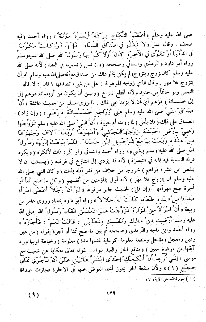 - صَلَّى اللَّهُ عَلَيْهِ وَسَلَّمَ - «أَعْظَمُ النِّكَاحِ بَرَكَةً أَيْسَرُهُ مُؤْنَةً» رَوَاهُ أَحْمَدُ وَفِيهِ ضَعْفٌ.