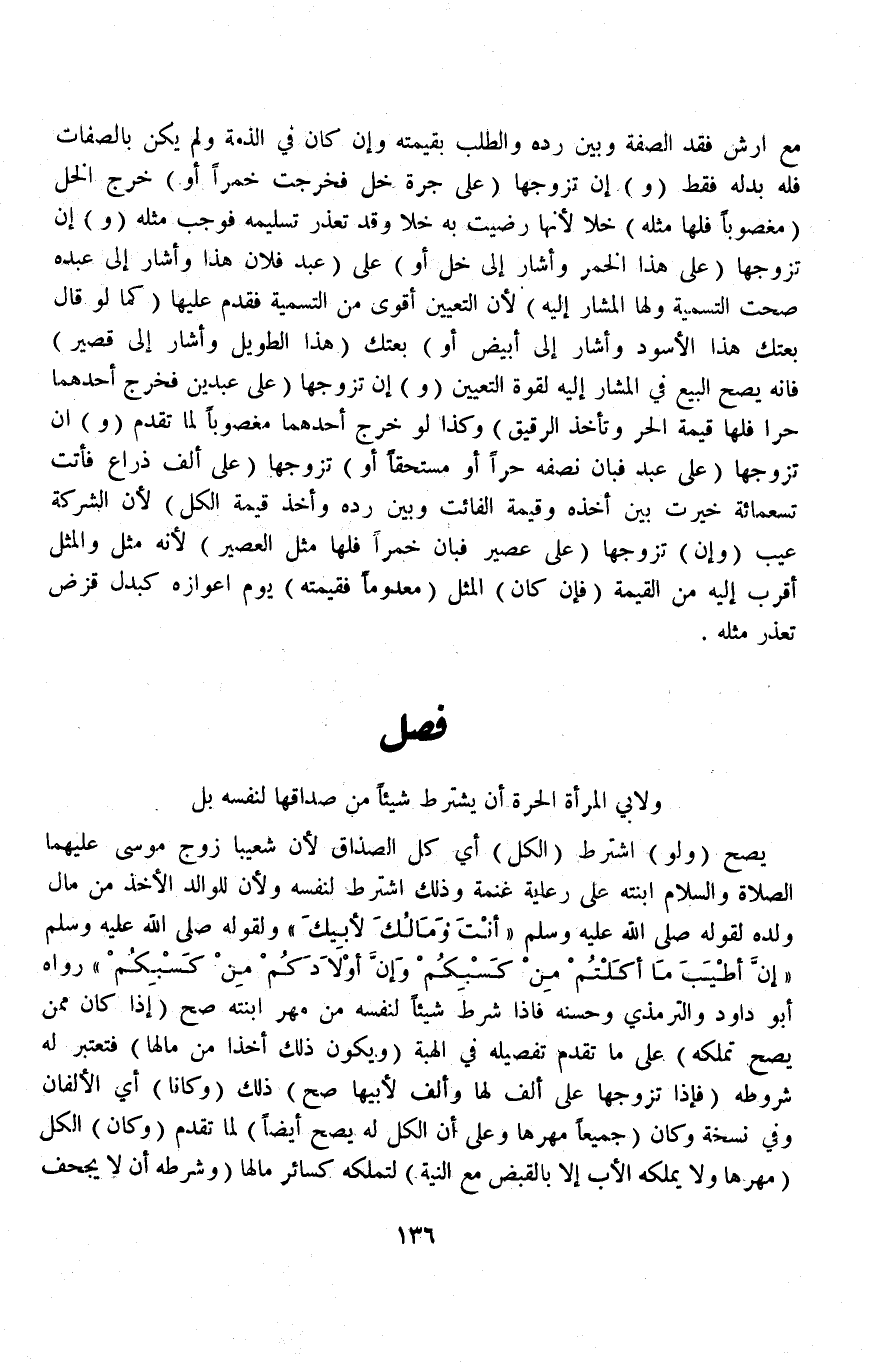 (فَصْلٌ وَلِأَبِي الْمَرْأَةِ الْحُرَّةِ أَنْ يَشْتَرِطَ شَيْئًا مِنْ صَدَاقِهَا لِنَفْسِهِ) بَلْ يَصِحُّ (وَلَوْ) اشْتَرَطَ (الْكُلَّ) أَيْ: كُلَّ الصَّدَاقِ لِأَنَّ شُعَيْبًا زَوَّجَ مُوسَى - عَلَيْهِمَا الصَّلَاةُ وَالسَّلَامُ - ابْنَتَهُ عَلَى رِعَايَةِ غَنَمِهِ وَذَلِكَ اشْتَرَطَ لِنَفْسِهِ وَلِأَنَّ لِلْوَالِدِ الْأَخْذَ مِنْ مَالِ وَلَدِهِ لِقَوْلِهِ - صَلَّى اللَّهُ عَلَيْهِ وَسَلَّمَ - «أَنْتَ وَمَالُكَ لِأَبِيكَ» وَلِقَوْلِهِ - صَلَّى اللَّهُ عَلَيْهِ وَسَلَّمَ - «إنَّ أَطْيَبَ مَا أَكَلْتُمْ مِنْ كَسْبِكُمْ وَإِنَّ أَوْلَادَكُمْ مِنْ كَسْبِكُمْ» رَوَاهُ أَبُو دَاوُد وَالتِّرْمِذِيُّ وَحَسَّنَهُ فَإِذَا شَرَط شَيْئًا لِنَفْسِهِ مِنْ مَهْرِ ابْنَتِهِ صَحَّ (إذَا كَانَ مِمَّنْ يَصِحُّ تَمَلُّكُهُ) عَلَى مَا تَقَدَّمَ تَفْصِيلُهُ فِي الْهِبَةِ (وَيَكُونُ ذَلِكَ أَخْذًا مِنْ مَالِهَا) فَتُعْتَبَرُ لَهُ شُرُوطُهُ (فَإِذَا تَزَوَّجَهَا عَلَى أَلْفٍ لَهَا وَأَلْفٍ لِأَبِيهَا صَحَّ) ذَلِكَ (وَكَانَا) أَيْ: الْأَلْفَانِ.