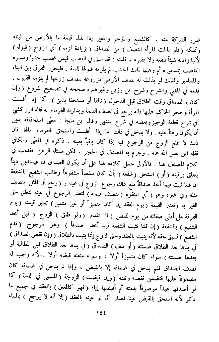 ضَرَرَ الشَّرِكَةَ عَنْهُ كَالشَّفِيعِ وَالْمُؤَجِّرِ وَالْمُعِيرِ إذَا بَذَلَ قِيمَةَ مَا بِالْأَرْضِ مِنْ الْبِنَاءِ وَتَمَلَّكَهُ (فَلَوْ بَذَلَتْ الْمَرْأَةُ النِّصْفَ) مِنْ الصَّدَاقِ (بِزِيَادَةٍ لَزِمَهُ) أَيْ: الزَّوْجُ (قَبُولُهُ) لِأَنَّهَا زَادَتْهُ شَيْئًا يَنْفَعُهُ وَلَا يَضُرُّهُ قُلْتُ قَدْ سَبَقَ فِي الْغَصْب فِيمَنْ غَصَبَ خَشَبًا وَسَمَّرَهُ الْغَاصِبُ بِمَسَامِيرِهِ ثُمَّ وَهَبَهَا لِمَالِكِ الْخَشَبِ لَمْ يَلْزَمْهُ قَبُولُهَا لِلْمِنَّةِ فَلِيُحَرِّرْ الْفَرْقَ بَيْنَ الْبِنَاءِ وَالْمَسَامِيرِ وَلِذَلِكَ لَوْ بَذَلَتْ لَهُ الْأَرْضَ مَزْرُوعَةً بِنِصْفِ زَرْعِهَا لَمْ يَلْزَمهُ الْقَبُولُ قَدَّمَهُ فِي الْمُغْنِي وَالشَّرْحِ وَشَرْحِ ابْنِ رَزِينٍ وَغَيْرِهِمْ وَصَحَّحَهُ فِي تَصْحِيحِ الْفُرُوعِ.