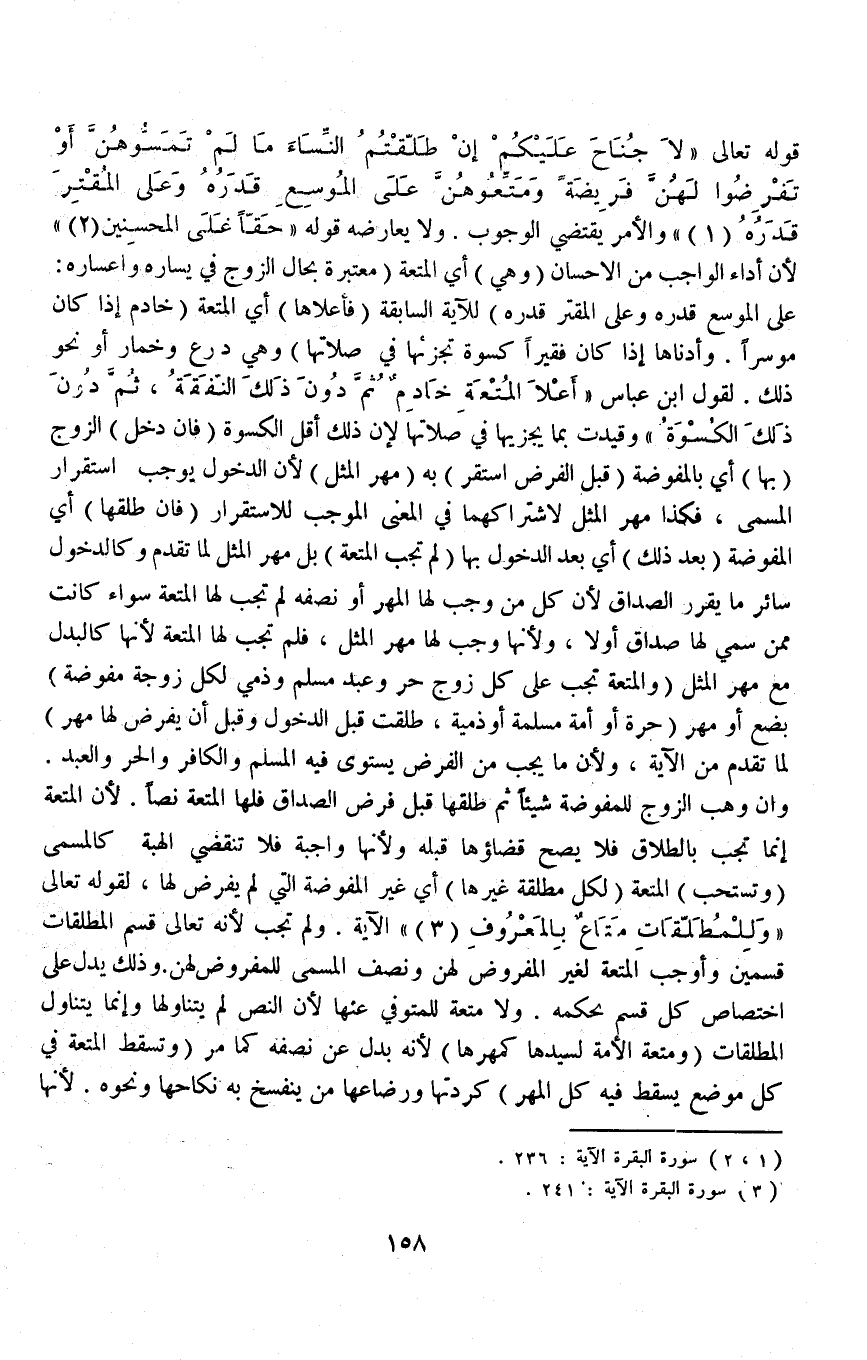 قَوْله تَعَالَى {لا جُنَاحَ عَلَيْكُمْ إِنْ طَلَّقْتُمُ النِّسَاءَ مَا لَمْ تَمَسُّوهُنَّ أَوْ تَفْرِضُوا لَهُنَّ فَرِيضَةً وَمَتِّعُوهُنَّ عَلَى الْمُوسِعِ قَدَرُهُ وَعَلَى الْمُقْتِرِ قَدَرُهُ} [البقرة: ٢٣٦] وَالْأَمْرُ يَقْتَضِي الْوُجُوبَ وَلَا يُعَارِضُهُ قَوْلُهُ {حَقًّا عَلَى الْمُحْسِنِينَ} [البقرة: ٢٣٦] لِأَنَّ أَدَاءَ الْوَاجِبِ مِنْ الْإِحْسَانِ.