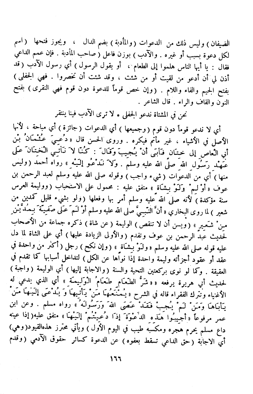 (وَلَيْسَ مِنْهَا) أَيْ مِنْ الدَّعَوَاتِ (شَيْءٌ وَاجِبٌ) وَقَوْلُهُ - صَلَّى اللَّهُ عَلَيْهِ وَسَلَّمَ - لِعَبْدِ الرَّحْمَنِ بْنِ عَوْفٍ «أَوْلِمْ وَلَوْ بِشَاةٍ» مُتَّفَقٌ عَلَيْهِ: مَحْمُولٌ عَلَى الِاسْتِحْبَابِ (وَوَلِيمَةُ الْعُرْسِ سُنَّةٌ مُؤَكَّدَةٌ) لِأَنَّهُ - صَلَّى اللَّهُ عَلَيْهِ وَسَلَّمَ - أَمَرَ بِهَا وَفَعَلَهَا.