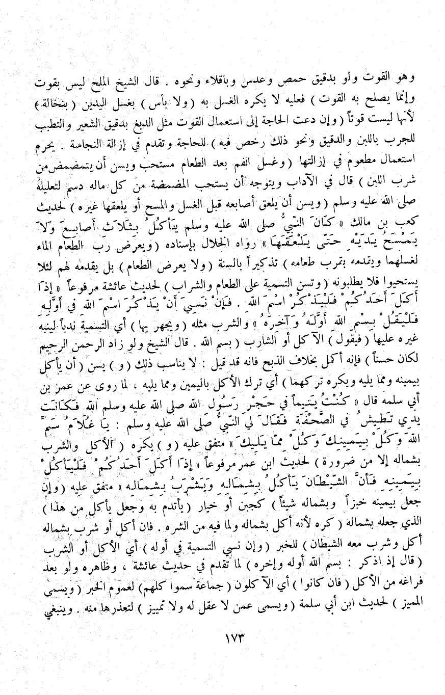 (وَتُسَنُّ التَّسْمِيَةُ عَلَى الطَّعَامِ وَالشَّرَابِ) لِحَدِيثِ عَائِشَةَ مَرْفُوعًا «إذَا أَكَلَ أَحَدكُمْ فَلْيَذْكُرْ اسْمَ اللَّهِ فَإِنْ نَسِيَ أَنْ يَذْكُرَ اسْمَ اللَّهِ فِي أَوَّلِهِ فَلْيَقُلْ بِسْمِ اللَّهِ أَوَّلَهُ وَآخِرَهُ» وَالشُّرْبُ مِثْلُهُ (وَيَجْهَرُ بِهَا) أَيْ التَّسْمِيَةُ نَدْبًا لِيُنَبِّهَ غَيْرَهُ عَلَيْهَا (فَيَقُولُ) الْآكِلُ أَوْ الشَّارِبُ (بِسْمِ اللَّهِ قَالَ الشَّيْخُ وَلَوْ زَادَ الرَّحْمَنِ الرَّحِيمِ لَكَانَ حَسَنًا) فَإِنَّهُ أَكْمَلُ بِخِلَافِ الذَّبْحِ فَإِنَّهُ قَدْ قِيلَ لَا يُنَاسِبُ ذَلِكَ.
