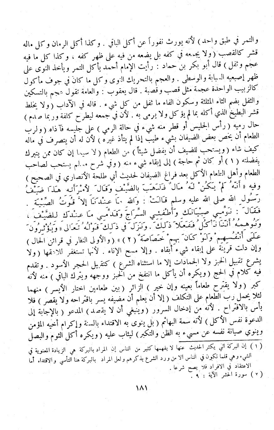وَالتَّمْرِ فِي طَبَقٍ وَاحِدٍ) لِأَنَّهُ يُوَرِّثُ نُفُورًا عَنْ أَكْلِ الْبَاقِي وَكَذَا أَكْلُ الرُّمَّانِ وَكُلُّ مَالَهُ قِشْرٌ كَالْقَصَبِ (وَلَا يَجْمَعُهُ فِي كَفِّهِ بَلْ يَضَعُهُ مِنْ فِيهِ عَلَى ظَهْرِ كَفِّهِ وَكَذَا كُلّ مَا فِيهِ عَجَمٌ وَثُفْلٌ) قَالَ أَبُو بَكْرِ بْنُ حَمَّادٍ رَأَيْتُ الْإِمَامَ أَحْمَدَ يَأْكُلُ التَّمْرَ وَيَأْخُذُ النَّوَى عَلَى ظَهْرِ إصْبَعَيْهِ السَّبَّابَةِ وَالْوُسْطَى وَالْعَجَمُ بِالتَّحْرِيكِ النَّوَى وَكُلُّ مَا كَانَ فِي جَوْفٍ مَأْكُولٍ كَالزَّبِيبِ الْوَاحِدَةُ عُجْمَةٌ مِثْلُ قَصَبٌ وَقَصَبَةٌ قَالَ يَعْقُوبُ وَالْعَامَّةُ تَقُولُ عَجْمٌ بِالتَّسْكِينِ وَالثُّفْلُ بِضَمِّ الثَّاءِ الْمُثَلَّثَةِ وَسُكُونِ الْفَاءِ مَا ثَفَلَ مِنْ كُلِّ شَيْءٍ قَالَهُ فِي الْآدَابِ.