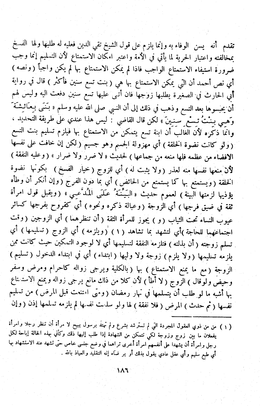 تَقَدَّمَ أَنَّهُ يُسَنُّ الْوَفَاءُ بِهِ وَإِنَّمَا يَلْزَمُ عَلَى قَوْلِ الشَّيْخِ تَقِيِّ الدِّينِ فَعَلَيْهِ لَهُ طَلَبُهَا وَلَهَا الْفَسْخُ بِمُخَالَفَتِهِ وَاعْتِبَارُ الْحُرِّيَّةِ لِمَا يَأْتِي فِي الْأَمَةِ وَاعْتُبِرَ إمْكَانُ الِاسْتِمْتَاعِ لِأَنَّ التَّسْلِيمَ إنَّمَا وَجَبَ ضَرُورَةُ اسْتِيفَاءِ الِاسْتِمْتَاعِ الْوَاجِبِ فَإِذَا لَمْ يُمْكِنْ الِاسْتِمْتَاعُ بِهَا لَمْ يَكُنْ وَاجِبًا (وَنَصَّهُ) أَيْ نَصَّ أَحْمَدُ أَنَّ الَّتِي يُمْكِنَ الِاسْتِمْتَاعُ بِهَا هِيَ (بِنْتُ تِسْعِ سِنِينَ فَأَكْثَرَ) قَالَ فِي رِوَايَةِ أَبِي الْحَارِثِ فِي الصَّغِيرَةِ يَطْلُبُهَا زَوْجُهَا فَإِنْ أَتَى عَلَيْهَا تِسْعُ سِنِينَ دُفِعَتْ إلَيْهِ وَلَيْسَ لَهُمْ أَنْ يَحْبِسُوهَا بَعْدَ التِّسْعِ وَذَهَبَ فِي ذَلِكَ أَنَّ النَّبِيَّ - صَلَّى اللَّهُ عَلَيْهِ وَسَلَّمَ - بَنَى بِعَائِشَةَ وَهِيَ بِنْتُ تِسْعِ سِنِينَ " لَكِنْ قَالَ الْقَاضِي لَيْسَ هَذَا عِنْدِي عَلَى طَرِيقَةِ التَّحْدِيدِ وَإِنَّمَا ذَكَرَهُ لِأَنَّ الْغَالِبَ أَنَّ ابْنَةَ تِسْعٍ يَتَمَكَّنُ مِنْ الِاسْتِمْتَاع بِهَا فَيَلْزَمُ تَسْلِيمُ بِنْتِ التِّسْعِ.