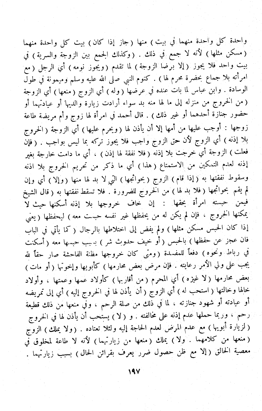 (وَلَهُ) أَيْ الزَّوْجِ (مَنْعُهَا) أَيْ الزَّوْجَةِ (مِنْ الْخُرُوجِ مِنْ مَنْزِلِهِ إلَى مَا لَهَا مِنْهُ بُدٌّ سَوَاءٌ أَرَادَتْ زِيَارَةَ وَالِدَيْهَا أَوْ عِيَادَتِهِمَا أَوْ حُضُورِ جِنَازَةِ أَحَدِهِمَا أَوْ غَيْرِ ذَلِكَ) قَالَ أَحْمَدُ فِي امْرَأَةٍ لَهَا زَوْجٌ وَأُمٌّ مَرِيضَةٌ طَاعَةُ زَوْجِهَا: أَوْجَبُ عَلَيْهَا مِنْ أُمِّهَا إلَّا أَنْ يَأْذَنَ لَهَا (وَيَحْرُمُ عَلَيْهَا) أَيْ الزَّوْجَةِ (الْخُرُوجُ بِلَا إذْنِهِ) أَيْ الزَّوْجِ لِأَنَّ حَقَّ الزَّوْج وَاجِبٌ فَلَا يَجُوزُ تَرْكُهُ بِمَا لَيْسَ بِوَاجِبٍ (فَإِنْ فَعَلَتْ) الزَّوْجَةُ أَيْ خَرَجَتْ بِلَا إذْنِهِ (فَلَا نَفَقَةَ لَهَا إذَنْ) أَيْ مَا دَامَتْ خَارِجَةً بِغَيْرِ إذْنِهِ لِعَدَمِ التَّمْكِينِ مِنْ الِاسْتِمْتَاعِ (هَذَا) أَيْ مَا ذُكِرَ مِنْ تَحْرِيمِ الْخُرُوجِ بِلَا إذْنِهِ وَسُقُوطِ نَفَقَتِهَا بِهِ (إذَا قَامَ) الزَّوْجُ (بِحَوَائِجِهَا) الَّتِي لَا بُدَّ لَهَا مِنْهَا.