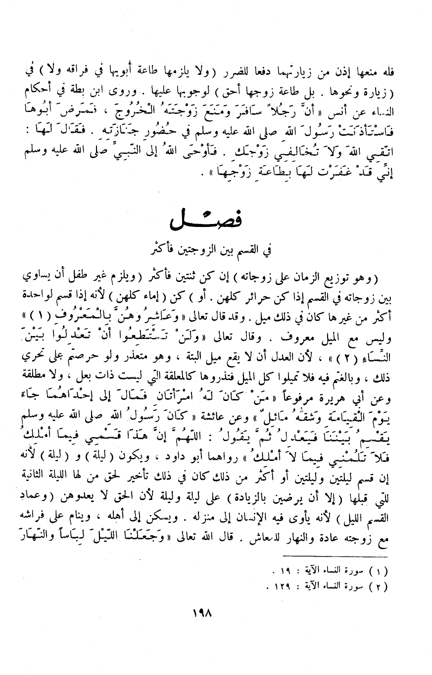 وَقَالَ تَعَالَى {وَلَنْ تَسْتَطِيعُوا أَنْ تَعْدِلُوا بَيْنَ النِّسَاءِ} [النساء: ١٢٩] ، لِأَنَّ الْعَدْلَ أَنْ لَا يَقَعَ مَيْلٌ أَلْبَتَّةَ، وَهُوَ مُتَعَذَّرٌ وَلَوْ حَرَصْتُمْ عَلَى تَحَرِّي ذَلِكَ، وَبَالَغْتُمْ فِيهِ فَلَا تَمِيلُوا كُلَّ الْمَيْلِ فَتَذَرُوهَا كَالْمُعَلَّقَةِ الَّتِي لَيْسَتْ ذَاتَ بَعْلٍ وَلَا مُطَلَّقَةٍ، وَعَنْ أَبِي هُرَيْرَةَ مَرْفُوعًا «مَنْ كَانَ لَهُ امْرَأَتَانِ فَمَال إلَى إحْدَاهُمَا جَاءَ يَوْمَ الْقِيَامَةِ وَشِقُّهُ مَائِلٌ» وَعَنْ عَائِشَةَ «كَانَ رَسُولُ اللَّهِ - صَلَّى اللَّهُ عَلَيْهِ وَسَلَّمَ - يُقَسِّمُ بَيْنِنَا فَيَعْدِلُ ثُمَّ يَقُولُ: اللَّهُمَّ إنَّ هَذَا قَسْمِي فِيمَا أَمْلِكُ فَلَا تَلُمْنِي فِيمَا لَا أَمْلِكُ» رَوَاهُمَا أَبُو دَاوُد.