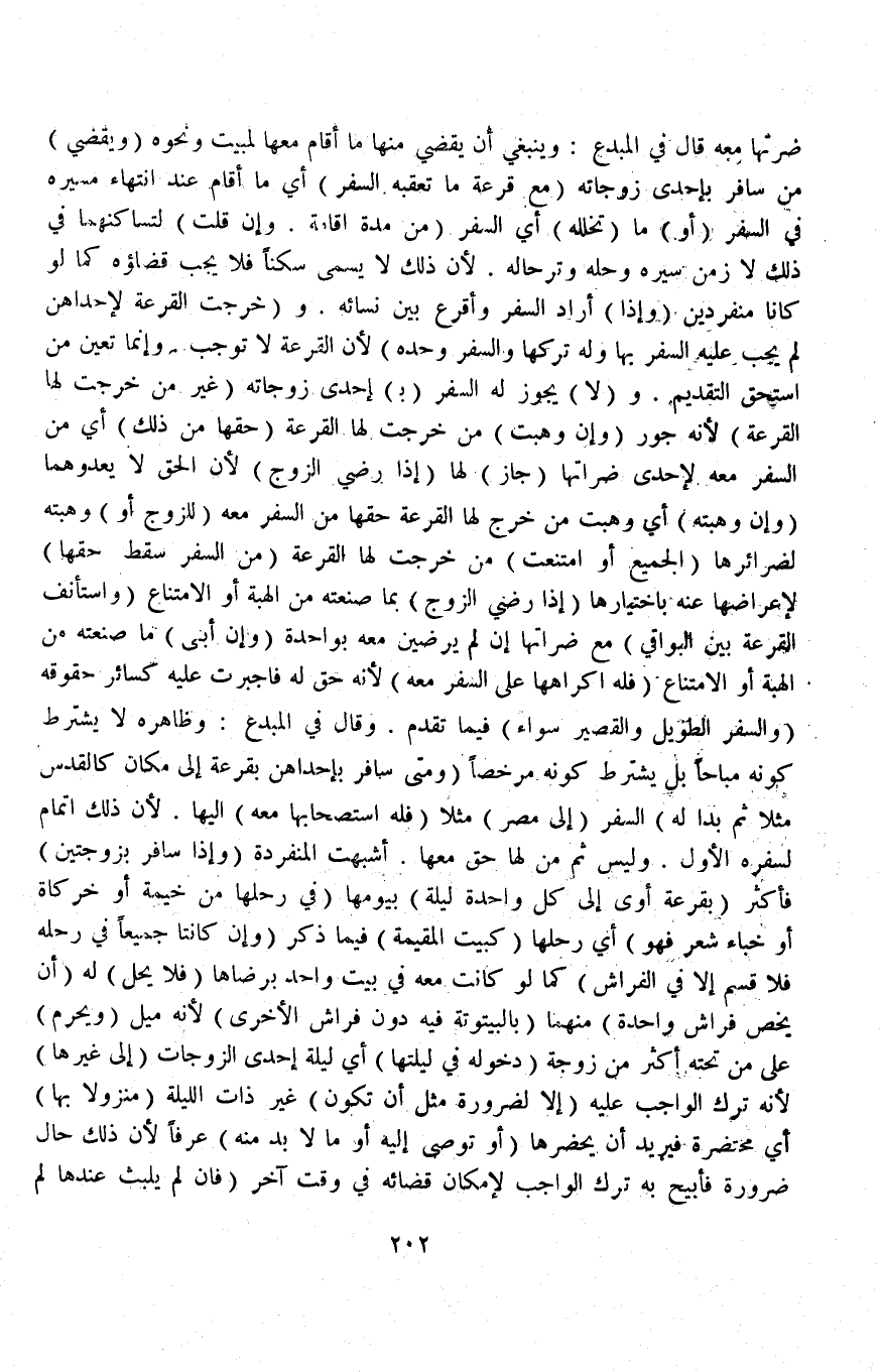 ضَرَّتِهَا مَعَهُ قَالَ فِي الْمُبْدِعِ: وَيَنْبَغِي أَنْ يُقْضَى مِنْهَا مَا أَقَامَ مَعَهَا لِمَبِيتٍ وَنَحْوِهِ (وَيَقْضِي) مَنْ سَافَرَ بِإِحْدَى زَوْجَاتِهِ (مَعَ قُرْعَةِ مَا تَعَقَّبَهُ السَّفَرَ) أَيْ مَا أَقَامَ عِنْدَ انْتِهَاء مَسِيرِهِ فِي السَّفَرِ (أَوْ) مَا (تَخَلَّلَهُ) أَيْ السَّفَرَ مِنْ (مُدَّةِ إقَامَةٍ وَإِنْ قَلَّتْ) لِتَسَاكُنِهِمَا فِي ذَلِكَ لَا زَمَنَ سَيْرِهِ وَحَلِّهِ وَتِرْحَالِهِ لِأَنَّ ذَلِكَ لَا يُسَمَّى سَكَنًا فَلَا يَجِبْ قَضَاؤُهُ كَمَا لَوْ كَانَا مُنْفَرِدِينَ.
