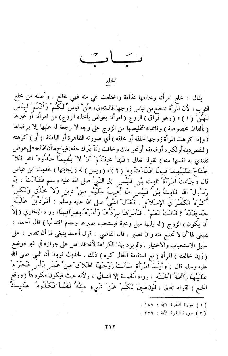 ِ يُقَال: خَلَعَ امْرَأَتِهِ وَخَالَعَهَا مُخَالَعَةً وَاخْتَلَعَتْ هِيَ مِنْهُ فَهِيَ خَالِعٌ وَأَصْلُهُ مِنْ خَلْعِ الثَّوْبِ لِأَنَّ الْمَرْأَةَ تَنْخَلِعُ مِنْ لِبَاسِ زَوْجِهَا قَالَ تَعَالَى {هُنَّ لِبَاسٌ لَكُمْ وَأَنْتُمْ لِبَاسٌ لَهُنَّ} [البقرة: ١٨٧] (وَهُوَ فِرَاقُ) الزَّوْجِ (امْرَأَتَهُ بِعِوَضٍ يَأْخُذُهُ الزَّوْجُ) مِنْ امْرَأَتِهِ أَوْ غَيْرِهَا (بِأَلْفَاظٍ مَخْصُوصَةٍ) وَفَائِدَتُهُ تَخْلِيصِهَا مِنْ الزَّوْج عَلَى وَجْهٍ لَا رَجْعَةَ لَهُ عَلَيْهَا إلَّا بِرِضَاهَا (وَإِذَا كَرِهَتْ الْمَرْأَةُ زَوْجَهَا لِخُلُقِهِ أَوْ خَلْقِهِ) أَيْ صُورَتِهِ الظَّاهِرَةِ أَوْ الْبَاطِنَةِ (أَوْ) كَرِهَتْهُ (لِنَقْصِ دِينِهِ أَوْ لِكِبَرِهِ أَوْ لِضَعْفِهِ أَوْ نَحْوِ ذَلِكَ وَخَافَتْ إثْمًا بِتَرْكِ حَقِّهِ فَيُبَاحُ لَهَا أَنْ تُخَالِعَهُ عَلَى عِوَضٍ تَفْتَدِي بِهِ نَفْسَهَا مِنْهُ) ' لِقَوْلِهِ تَعَالَى {فَإِنْ خِفْتُمْ أَلا يُقِيمَا حُدُودَ اللَّهِ فَلا جُنَاحَ عَلَيْهِمَا فِيمَا افْتَدَتْ بِهِ ِ} [البقرة: ٢٢٩] (وَيُسَنُّ) لَهُ (إجَابَتُهَا) لِحَدِيثِ ابْنِ عَبَّاسٍ قَالَ «جَاءَتْ امْرَأَةُ ثَابِتِ بْنِ قَيْسٍ إلَى النَّبِيِّ - صَلَّى اللَّهُ عَلَيْهِ وَسَلَّمَ - فَقَالَتْ: يَا رَسُولَ اللَّهِ ثَابِتُ بْنُ قَيْسٍ مَا أَعِيبُ عَلَيْهِ مِنْ دِينٍ وَلَا خُلُقٍ وَلَكِنْ أَكْرَهُ الْكُفْرَ فِي الْإِسْلَامِ فَقَالَ النَّبِيُّ - صَلَّى اللَّهُ عَلَيْهِ وَسَلَّمَ -: أَتَرُدِّينَ عَلَيْهِ حَدِيقَتَهُ؟ قَالَتْ نَعَمْ فَأَمَرَهَا بِرَدِّهَا وَأَمَرَهُ بِفِرَاقِهَا» رَوَاهُ الْبُخَارِيُّ.