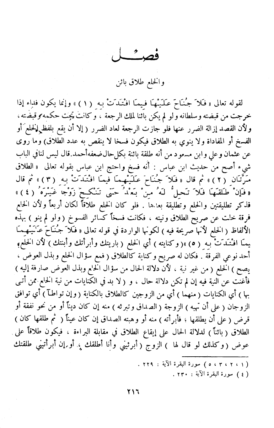 فَصْلٌ وَالْخُلْعُ طَلَاقٌ بَائِنٌ لِقَوْلِهِ تَعَالَى {فَلا جُنَاحَ عَلَيْهِمَا فِيمَا افْتَدَتْ بِهِ} [البقرة: ٢٢٩] وَإِنَّمَا يَكُونُ فِدَاءً إذَا خَرَجَتْ مِنْ قَبْضَتِهِ وَسُلْطَانِهِ وَلَوْ لَمْ يَكُنْ بَائِنًا لَمَلِكَ الرَّجْعَةَ، وَكَانَتْ تَحْت حُكْمِهِ وَقَبْضَتِهِ، وَلِأَنَّ الْقَصْد إزَالَةُ الضَّرَرِ عَنْهَا فَلَوْ جَازَتْ الرَّجْعَةُ لَعَادَ الضَّرَرُ (إلَّا أَنْ يَقَعَ بِلَفْظِ الْخُلْعِ أَوْ الْفَسْخِ أَوْ الْمُفَادَاةِ وَلَا يَنْوِي بِهِ الطَّلَاقَ فَيَكُونُ فَسْخًا لَا يَنْقُصُ بِهِ عَدَدُ الطَّلَاقِ) وَمَا رُوِيَ عَنْ عُثْمَانَ وَعَلِيٍّ وَابْنِ مَسْعُودٍ مِنْ أَنَّهُ طَلْقَةً بَائِنَةً بِكُلِّ حَالٍ ضَعَّفَهُ أَحْمَدُ قَالَ لَيْسَ لَنَا فِي الْبَابِ شَيْءٌ أَصَحُّ مِنْ حَدِيثِ ابْنِ عَبَّاسٍ أَنَّهُ فَسْخ وَاحْتَجَّ ابْن عَبَّاس بِقَوْلِهِ تَعَالَى {الطَّلاقُ مَرَّتَانِ} [البقرة: ٢٢٩] ثُمَّ قَالَ {فَلا جُنَاحَ عَلَيْهِمَا فِيمَا افْتَدَتْ بِهِ} [البقرة: ٢٢٩] ثُمَّ قَالَ {فَإِنْ طَلَّقَهَا فَلا تَحِلُّ لَهُ مِنْ بَعْدُ حَتَّى تَنْكِحَ زَوْجًا غَيْرَهُ} [البقرة: ٢٣٠] فَذَكَر تَطْلِيقَتَيْنِ وَالْخُلْعَ وَتَطْلِيقَةً بَعْدَهَا فَلَوْ كَانَ الْخُلْعُ طَلَاقًا لَكَانَ أَرْبَعًا وَلِأَنَّ الْخُلْعَ فُرْقَةٌ خَلَتْ عَنْ صَرِيحِ الطَّلَاقِ وَنِيَّتِهِ، فَكَانَتْ فَسْخًا كَسَائِرِ الْفُسُوخِ (وَلَوْ لَمْ يَنْوِ) بِهَذِهِ الْأَلْفَاظِ (الْخُلْعَ لِأَنَّهَا صَرِيحَةٌ فِيهِ) لِكَوْنِهَا الْوَارِدَة فِي قَوْله تَعَالَى {فَلا جُنَاحَ عَلَيْهِمَا فِيمَا افْتَدَتْ بِهِ} [البقرة: ٢٢٩] .