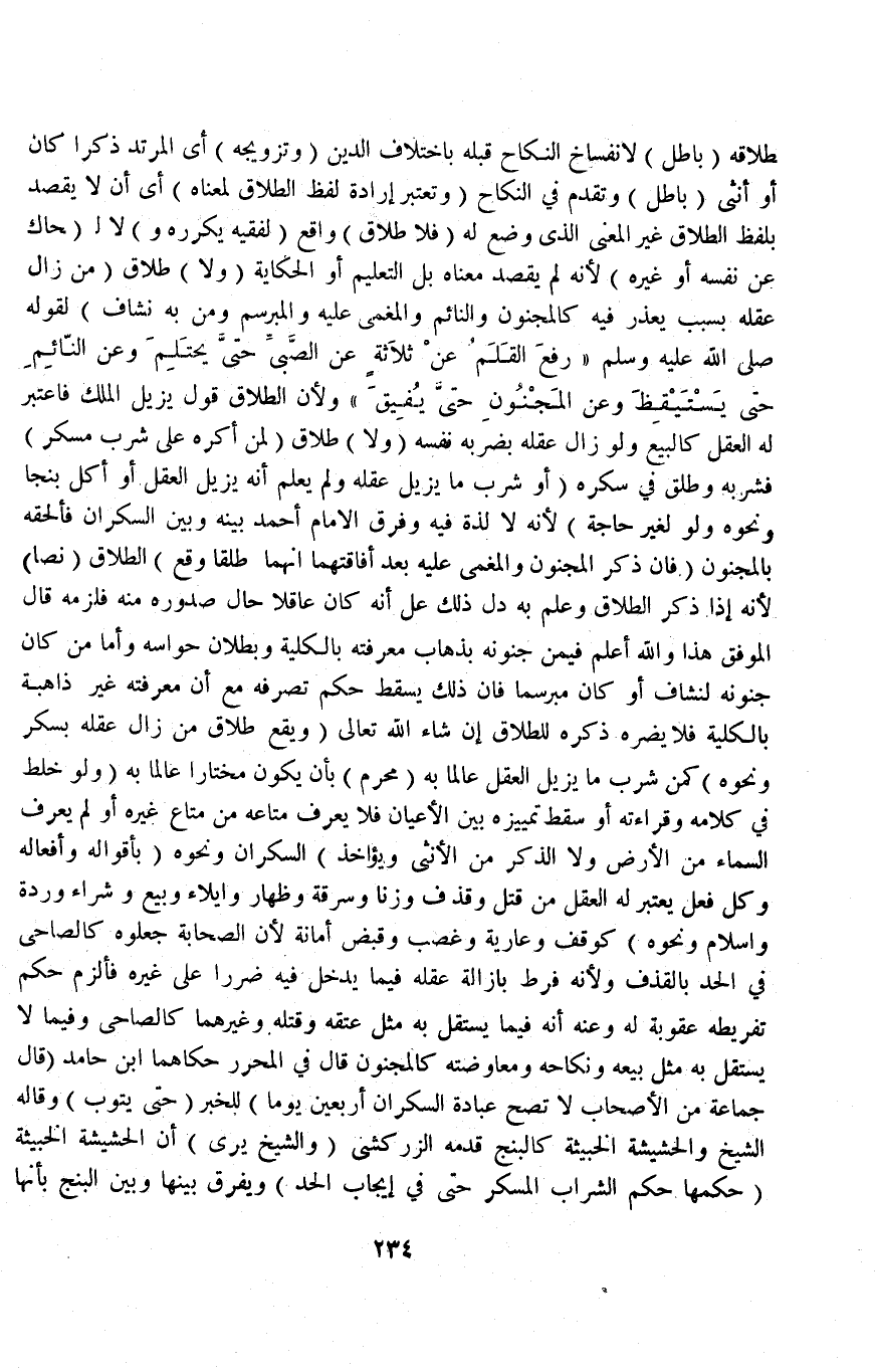 (وَيَقَعُ طَلَاقُ مَنْ زَالَ عَقْلُهُ بِسُكْرٍ وَنَحْوِهِ) كَمَنْ شَرِبَ مَا يُزِيلُ الْعَقْلَ عَالِمًا بِهِ مُحَرَّمٌ بِأَنْ يَكُونَ مُخْتَارًا عَالِمًا بِهِ (وَلَوْ خَلَطَ فِي كَلَامِهِ وَقِرَاءَتِهِ أَوْ سَقَطَ تَمْيِيزُهُ بَيْنَ الْأَعْيَانِ فَلَا يَعْرِفُ مَتَاعَهُ مِنْ مَتَاعِ غَيْرِهِ أَوْ لَمْ يَعْرِفْ السَّمَاءَ مِنْ الْأَرْضِ وَلَا الذَّكَرَ مِنْ الْأُنْثَى وَيُؤَاخَذُ) السَّكْرَانُ وَنَحْوُهُ (بِأَقْوَالِهِ وَأَفْعَالِهِ وَكُلِّ فِعْلٍ يُعْتَبَرُ لَهُ الْعَقْلُ مِنْ قَتْلٍ وَقَذْفٍ وَزِنًا وَسَرِقَةٍ وَظِهَارٍ وَإِيلَاءٍ وَبَيْعٍ وَشِرَاءٍ وَرِدَّةٍ وَإِسْلَامٍ وَنَحْوِهِ) كَوَقْفٍ وَعَارِيَّةٍ وَغَصْبٍ وَقَبْضِ أَمَانَةٍ لِأَنَّ الصَّحَابَةَ جَعَلُوهُ كَالصَّاحِي فِي الْحَدِّ بِالْقَذْفِ وَلِأَنَّهُ فَرَّطَ بِإِزَالَةِ عَقْلِهِ فِيمَا يُدْخِلُ فِيهِ ضَرَرًا عَلَى غَيْرِهِ فَأُلْزِمَ حُكْمَ تَفْرِيطِهِ عُقُوبَةً لَهُ وَعَنْهُ أَنَّهُ فِيمَا يَسْتَقِلُّ بِهِ مِثْلَ عِتْقِهِ وَقَتْلِهِ وَغَيْرِهِمَا كَالصَّاحِي وَفِيمَا لَا يَسْتَقِلُّ بِهِ مِثْلَ بَيْعِهِ وَنِكَاحِهِ وَمُعَاوَضَتِهِ كَالْمَجْنُونِ قَالَ فِي الْمُحَرَّرِ حَكَاهُمَا ابْنُ حَامِدٍ قَالَ جَمَاعَةٌ مِنْ الْأَصْحَابِ (لَا تَصِحُّ عِبَادَةُ السَّكْرَانِ أَرْبَعِينَ يَوْمًا) - لِلْخَبَرِ - (حَتَّى يَتُوبَ) وَقَالَهُ الشَّيْخُ وَالْحَشِيشَةُ الْخَبِيثَةُ كَالْبَنْجِ قَدَّمَهُ الزَّرْكَشِيّ (وَالشَّيْخُ يَرَى) أَنَّ الْحَشِيشَةَ الْخَبِيثَةَ (حُكْمُهَا حُكْمُ الشَّرَابِ الْمُسْكِرِ حَتَّى فِي إيجَابِ الْحَدِّ) وَيُفَرَّقُ بَيْنَهَا وَبَيْنَ الْبَنْجِ بِأَنَّهَا