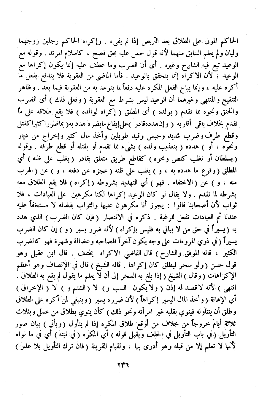 الْحَاكِمِ الْمُولِي عَلَى الطَّلَاقِ بَعْدَ التَّرَبُّصِ إذَا لَمْ يَفِئْ وَإِكْرَاهُ الْحَاكِم رَجُلَيْنِ زَوَّجَهُمَا وَلِيَّانِ وَلَمْ يُعْلَمْ السَّابِقُ مِنْهُمَا لِأَنَّهُ قَوْلٌ حُمِلَ عَلَيْهِ بِحَقٍّ فَصَحَّ، كَإِسْلَامِ الْمُرْتَدِّ، وَقَوْلُهُ مَعَ الْوَعِيدِ تَبِعَ فِيهِ الشَّارِحَ وَغَيْرَهُ أَيْ إنَّ الضَّرْبَ وَمَا عُطِفَ عَلَيْهِ إنَّمَا يَكُونُ إكْرَاهًا مَعَ الْوَعِيدِ، لِأَنَّ الْإِكْرَاهَ إنَّمَا يَتَحَقَّقُ بِالْوَعِيدِ فَأَمَّا الْمَاضِي مِنْ الْعُقُوبَةِ فَلَا يَنْدَفِعُ بِفِعْلِ مَا أُكْرِهَ عَلَيْهِ، وَإِنَّمَا يُبَاحُ الْفِعْلُ الْمُكْرَهُ عَلَيْهِ دَفْعًا لِمَا يُتَوَعَّدُ بِهِ مِنْ الْعُقُوبَةِ فِيمَا بَعْدُ، وَظَاهِرُ التَّنْقِيحِ وَالْمُنْتَهَى وَغَيْرِهِمَا أَنَّ الْوَعِيدَ لَيْسَ بِشَرْطٍ مَعَ الْعُقُوبَةِ (وَفِعْلُ ذَلِكَ) أَيْ الضَّرْبِ وَالْخَنْقِ وَنَحْوِهِ مِمَّا تَقَدَّمَ (بِوَلَدِهِ) أَيْ الْمُطَلِّقِ (إكْرَاهٌ لِوَالِدِهِ) فَلَا يَقَعُ طَلَاقُهُ عَلَى مَا تَقَدَّمَ بِخِلَافِ بَاقِي أَقَارِبِهِ.