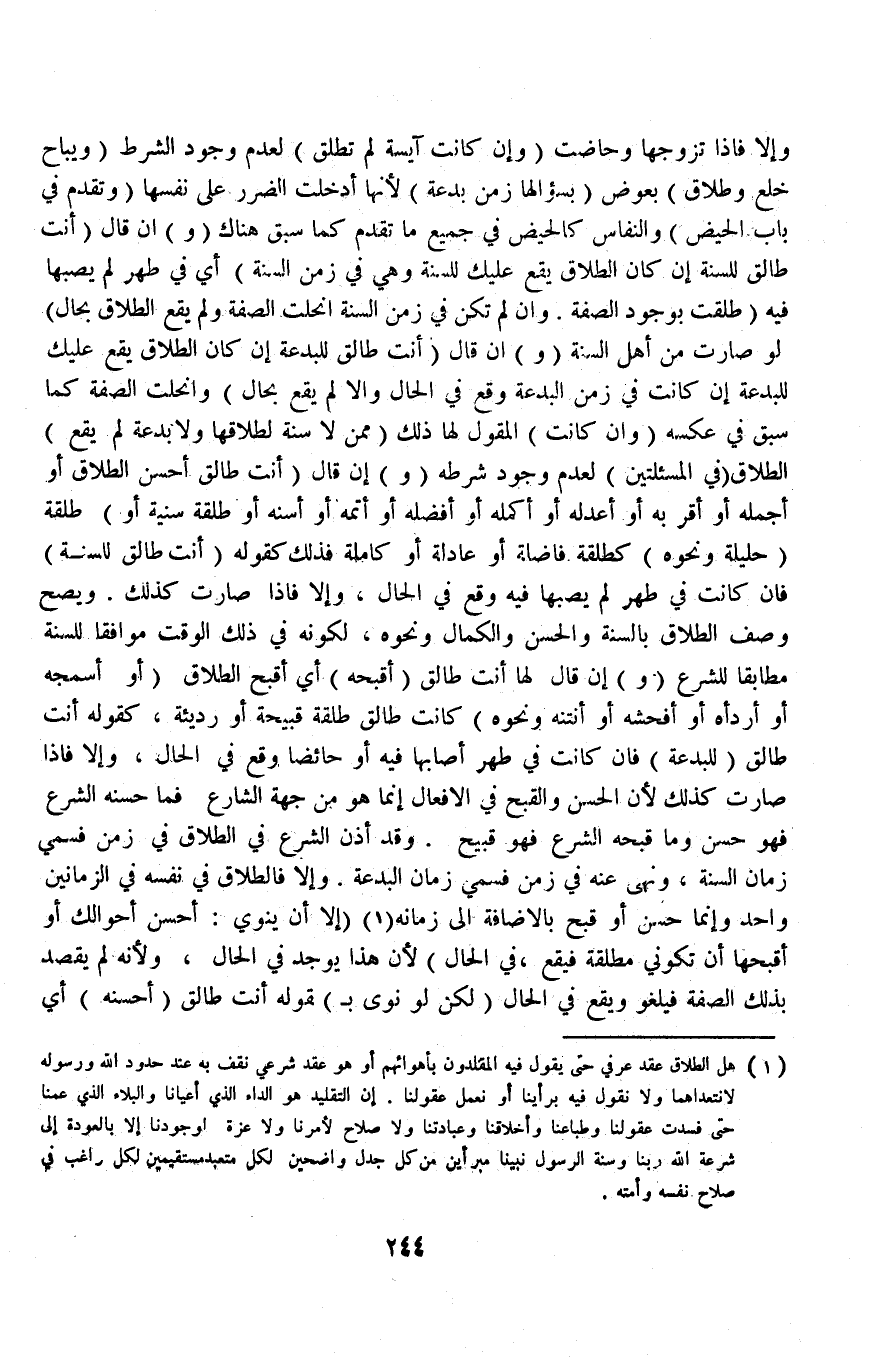 كَقَوْلِهِ أَنْتِ طَالِقٌ (لِلْبِدْعَةِ) فَإِنْ كَانَتْ فِي طُهْرٍ أَصَابَهَا فِيهِ أَوْ حَائِضًا وَقَعَ فِي الْحَالِ، وَإِلَّا فَإِذَا صَارَتْ كَذَلِكَ لِأَنَّ الْحُسْنَ وَالْقُبْحَ فِي الْأَفْعَالِ إنَّمَا هُوَ مِنْ جِهَةِ الشَّارِعِ فَمَا حَسَّنَهُ الشَّرْعُ فَهُوَ حَسَنٌ وَمَا قَبَّحَهُ الشَّرْعُ فَهُوَ قَبِيحٌ وَقَدْ أَذِنَ الشَّرْعُ فِي الطَّلَاقِ فِي زَمَنِ فَسُمِّيَ زَمَانَ السُّنَّةِ، وَنَهَى عَنْهُ فِي زَمَنٍ فَسُمِّيَ زَمَانَ الْبِدْعَةِ وَإِلَّا فَالطَّلَاقُ فِي نَفْسِهِ فِي الزَّمَانَيْنِ وَاحِدٌ وَإِنَّمَا حَسُنَ أَوْ قَبُحَ بِالْإِضَافَةِ إلَى زَمَانِهِ (إلَّا أَنْ يَنْوِيَ: أَحْسَنَ أَحْوَالِكِ أَوْ أَقْبَحَهَا أَنْ تَكُونِي مُطَلَّقَةً فَيَقَعُ، فِي الْحَالِ) لِأَنَّ هَذَا يُوجَدُ فِي الْحَالِ، وَلِأَنَّهُ لَمْ يَقْصِدْ بِذَلِكَ الصِّفَةَ فَيَلْغُو وَيَقَعُ فِي الْحَالِ (لَكِنْ لَوْ نَوَى) بِقَوْلِهِ أَنْتِ طَالِقٌ (أَحْسَنَهُ) أَيْ
