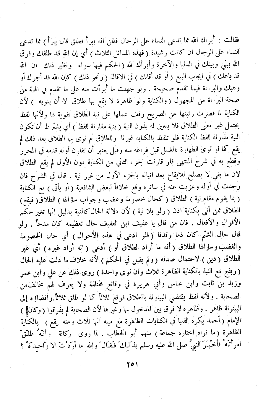 (وَيَقَعُ مَعَ النِّيَّةِ بِالْكِنَايَةِ الظَّاهِرَةِ ثَلَاثٌ وَإِنْ نَوَى وَاحِدَةً) رُوِيَ ذَلِكَ عَنْ عَلِيٍّ وَابْنِ عُمَرَ وَزَيْدِ بْنِ ثَابِتٍ وَابْنِ عَبَّاسٍ وَأَبِي هُرَيْرَةَ فِي وَقَائِعَ مُخْتَلِفَةٍ وَلَا يُعْرَفُ لَهُمْ مُخَالِفٌ مِنْ الصَّحَابَةِ وَلِأَنَّهُ لَفْظٌ يَقْتَضِي الْبَيْنُونَةَ بِالطَّلَاقِ فَوَقَعَ ثَلَاثًا كَمَا لَوْ طَلَّقَ ثَلَاثًا وَإِفْضَاؤُهُ إلَى الْبَيْنُونَةِ ظَاهِرٌ وَظَاهِرُهُ لَا فَرْقَ بَيْنَ الْمَدْخُولِ بِهَا وَغَيْرِهَا لِأَنَّ الصَّحَابَةَ لَمْ يُفَرِّقُوا (وَكَانَ) الْإِمَامُ (أَحْمَدُ يَكْرَهُ الْفُتْيَا فِي الْكِنَايَاتِ الظَّاهِرَةِ مَعَ مَيْلِهِ أَنَّهَا ثَلَاثٌ وَعَنْهُ يَقَعُ) بِالْكِنَايَةِ الظَّاهِرَةِ (مَا نَوَاهُ اخْتَارَهُ جَمَاعَةٌ) مِنْهُمْ أَبُو الْخَطَّابِ لِمَا رَوَى «رُكَانَةُ أَنَّهُ طَلَّقَ امْرَأَتَهُ فَأَخْبَرَ النَّبِيَّ - صَلَّى اللَّهُ عَلَيْهِ وَسَلَّمَ - بِذَلِكَ فَقَالَ وَاَللَّهِ مَا أَرَدْت إلَّا وَاحِدَةً؟