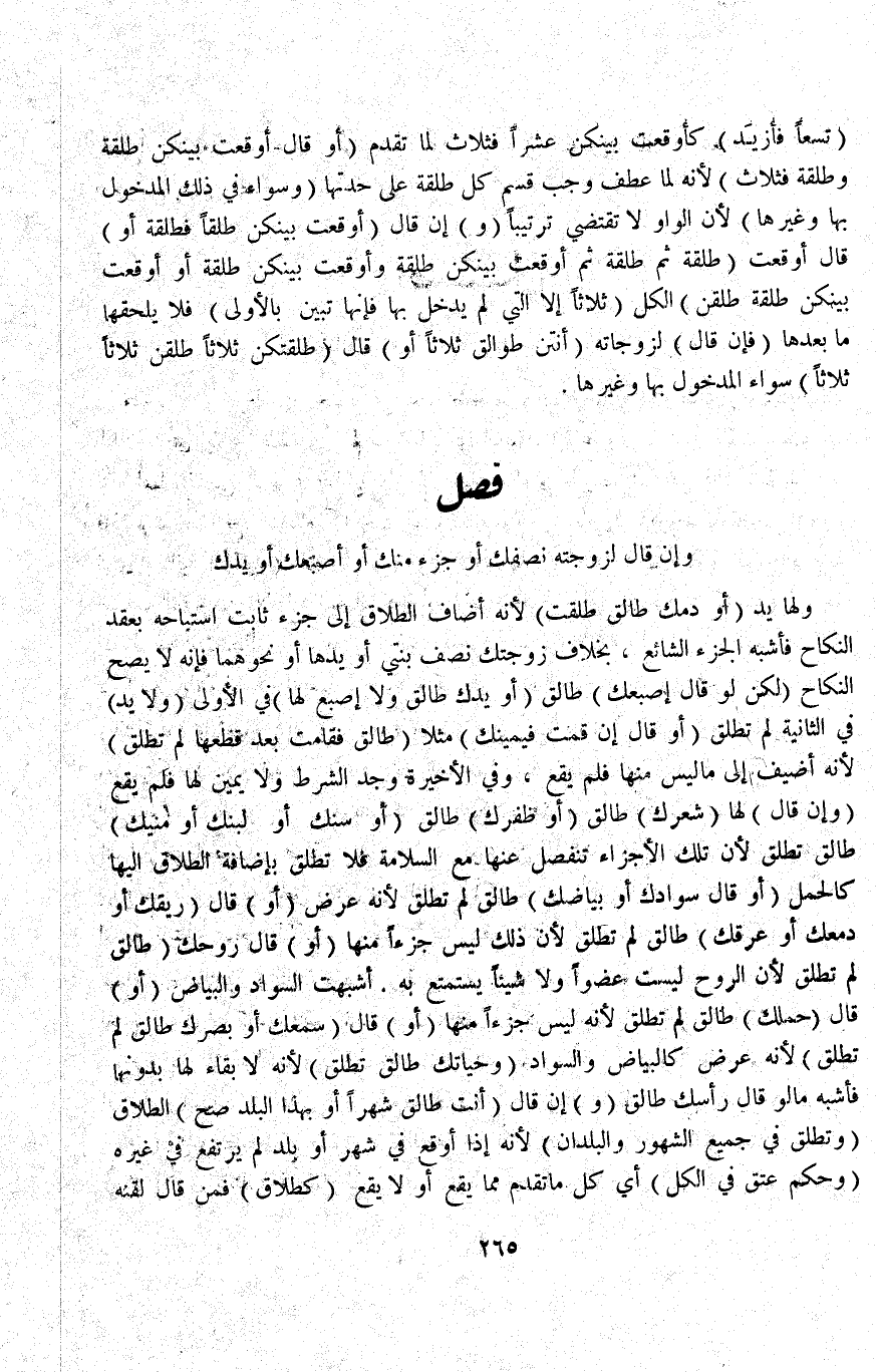فَصْل (وَإِنْ قَالَ لِزَوْجَتِهِ نِصْفُكِ أَوْ جُزْءٌ مِنْك أَوْ إصْبَعُكِ أَوْ يَدُكِ) وَلَهَا يَدٌ (أَوْ دَمُكِ طَالِقٌ طَلُقَتْ) لِأَنَّهُ أَضَافَ الطَّلَاقَ إلَى جُزْءٍ ثَابِتٍ اسْتَبَاحَهُ بِعَقْدِ النِّكَاحِ فَأَشْبَهَ الْجُزْءَ الشَّائِعَ بِخِلَافِ زَوَّجْتُكَ نِصْفَ بِنْتِي أَوْ يَدَهَا أَوْ نَحْوَهُمَا فَإِنَّهُ لَا يَصِحُّ النِّكَاحُ (لَكِنْ لَوْ قَالَ إصْبَعُكِ) طَالِقٌ (أَوْ يَدُكِ طَالِقٌ وَلَا أُصْبُعَ لَهَا) فِي الْأُولَى (وَلَا يَدَ) فِي الثَّانِيَةِ لَمْ تَطْلُقْ (أَوْ قَالَ إنْ قُمْتِ فَيَمِينُكِ) مَثَلًا (طَالِقٌ فَقَامَتْ بَعْدَ قَطْعِهَا لَمْ تَطْلُقْ) لِأَنَّهُ أُضِيفَ إلَى مَا لَيْسَ مِنْهَا فَلَمْ يَقَعْ، وَفِي الْأَخِيرَةِ وُجِدَ الشَّرْطُ وَلَا يَمِينَ لَهَا فَلَمْ يَقَعْ.