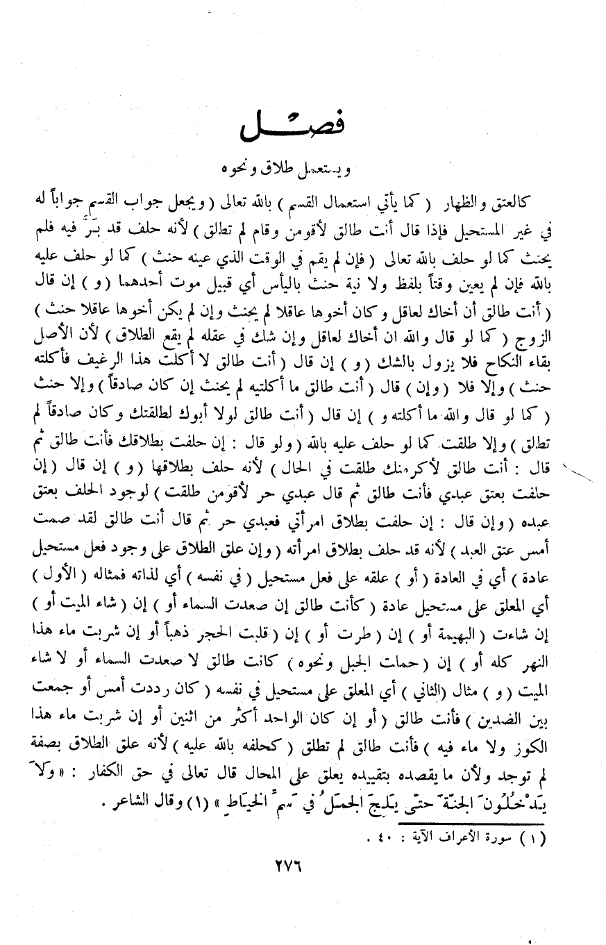 وَلِأَنَّ مَا يَقْصِدُهُ بِتَقْيِيدِهِ يُعَلَّقُ عَلَى الْمُحَالِ قَالَ تَعَالَى فِي حَقِّ الْكُفَّارِ {وَلا يَدْخُلُونَ الْجَنَّةَ حَتَّى يَلِجَ الْجَمَلُ فِي سَمِّ الْخِيَاطِ} [الأعراف: ٤٠] وَقَالَ الشَّاعِر: