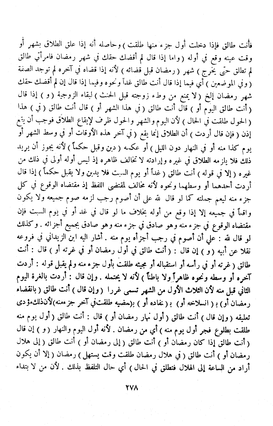 (وَ) إنْ قَالَ (أَنْتِ طَالِقٌ فِي أَوَّلِ رَمَضَانَ أَوْ فِي غُرَّتِهِ أَوْ) قَالَ أَنْتِ طَالِقٌ (غُرَّتَهُ أَوْ فِي رَأْسِهِ أَوْ اسْتِقْبَالِهِ أَوْ مَجِيئِهِ طَلُقَتْ بِأَوَّلِ جُزْءٍ مِنْهُ وَلَمْ يُقْبَلْ قَوْلُهُ: أَرَدْتُ آخِرَهُ أَوْ وَسَطَهُ وَنَحْوَهُ ظَاهِرًا وَلَا بَاطِنًا) لِأَنَّهُ لَا يَحْتَمِلُهُ وَإِنْ قَالَ أَرَدْتُ بِالْغُرَّةِ الْيَوْمَ الثَّانِي قُبِلَ مِنْهُ لِأَنَّ الثَّلَاثَ الْأُوَلَ مِنْ الشَّهْرِ تُسَمَّى غَرَرًا (وَإِنْ قَالَ) أَنْتِ طَالِقٌ (بِانْقِضَاءِ رَمَضَانَ أَوْ) بِ (انْسِلَاخِهِ أَوْ) بِ (نَفَادِهِ أَوْ) بِ (مُضِيِّهِ طَلُقَتْ فِي آخِرِ جُزْءٍ مِنْهُ) لِأَنَّ ذَلِكَ ` مُؤَدَّى تَعْلِيقِهِ (وَإِنْ قَالَ) أَنْتِ طَالِقٌ (أَوَّلَ نَهَارِ رَمَضَانَ أَوْ) قَالَ أَنْتِ طَالِقٌ (أَوَّلَ يَوْمٍ مِنْهُ طَلُقَتْ بِطُلُوعِ فَجْرِ أَوَّلِ يَوْمٍ مِنْهُ) أَيْ مِنْ رَمَضَانَ لِأَنَّهُ أَوَّلُ الْيَوْمِ وَالنَّهَارِ.