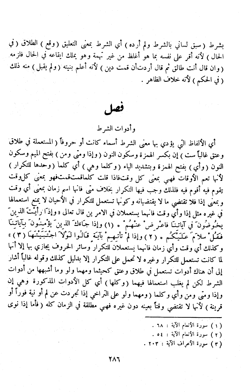 فَصْلٌ (وَأَدَوَاتُ الشَّرْطِ) أَيْ الْأَلْفَاظُ الَّتِي يُؤَدَّى بِهَا مَعْنَى الشَّرْطِ أَسْمَاءً كَانَتْ أَوْ حُرُوفًا (الْمُسْتَعْمَلَةُ فِي طَلَاقٍ وَعِتْقٍ غَالِبًا سِتٌّ إنْ) بِكَسْرِ الْهَمْزَة وَسُكُونِ النُّونِ (وَإِذَا وَمَتَى وَمَنْ) بِفَتْحِ الْمِيمِ وَسُكُونِ النُّونِ (وَأَيَّ) بِفَتْحِ الْهَمْزَةِ وَبِتَشْدِيدِ الْيَاءِ (وَكُلَّمَا وَهِيَ) أَيْ: كُلَّمَا (وَحْدَهَا لِلتَّكْرَارِ) لِأَنَّهَا تَعُمُّ الْأَوْقَاتِ فَهِيَ بِمَعْنَى كُلِّ وَقْتٍ فَإِذَا قُلْتَ: كُلَّمَا قُمْتَ قُمْتُ فَهُوَ بِمَعْنَى كُلُّ وَقْتٍ تَقُومُ فِيهِ أَقُومُ فِيهِ فَلِذَلِكَ وَجَبَ فِيهَا التَّكْرَارُ بِخِلَافِ مَتَى فَإِنَّهَا اسْمُ زَمَانٍ بِمَعْنَى أَيُّ وَقْتٍ وَبِمَعْنَى إذَا، فَلَا تَقْتَضِي مَا لَا يَقْتَضِيَانِهِ، وَكَوْنُهَا تُسْتَعْمَلُ لِلتَّكْرَارِ فِي الْأَحْيَانِ لَا يَمْنَعُ اسْتِعْمَالهَا فِي غَيْرِهِ مِثْلَ إذَا وَأَيِّ وَقْتٍ فَإِنَّهُمَا يُسْتَعْمَلَانِ فِي الْأَمْرَيْنِ قَالَ تَعَالَى {وَإِذَا رَأَيْتَ الَّذِينَ يَخُوضُونَ فِي آيَاتِنَا فَأَعْرِضْ عَنْهُمْ} [الأنعام: ٦٨]- {وَإِذَا جَاءَكَ الَّذِينَ يُؤْمِنُونَ بِآيَاتِنَا فَقُلْ سَلامٌ عَلَيْكُمْ} [الأنعام: ٥٤]- {وَإِذَا لَمْ تَأْتِهِمْ بِآيَةٍ قَالُوا لَوْلا اجْتَبَيْتَهَا} [الأعراف: ٢٠٣] .