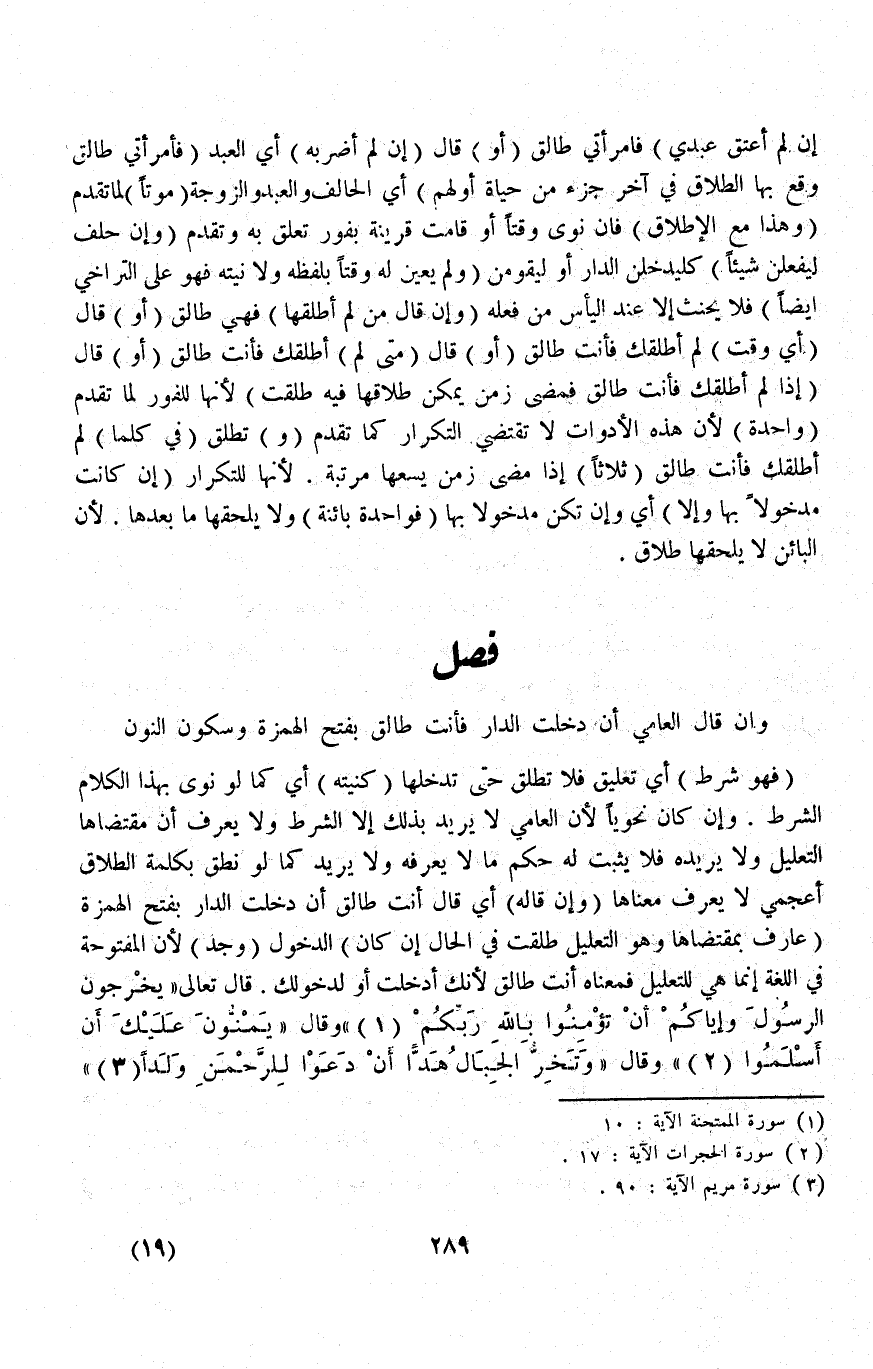 [فَصْل قَالَ الْعَامِّيُّ إنْ دَخَلْتِ الدَّارَ فَأَنْتِ طَالِقٌ]