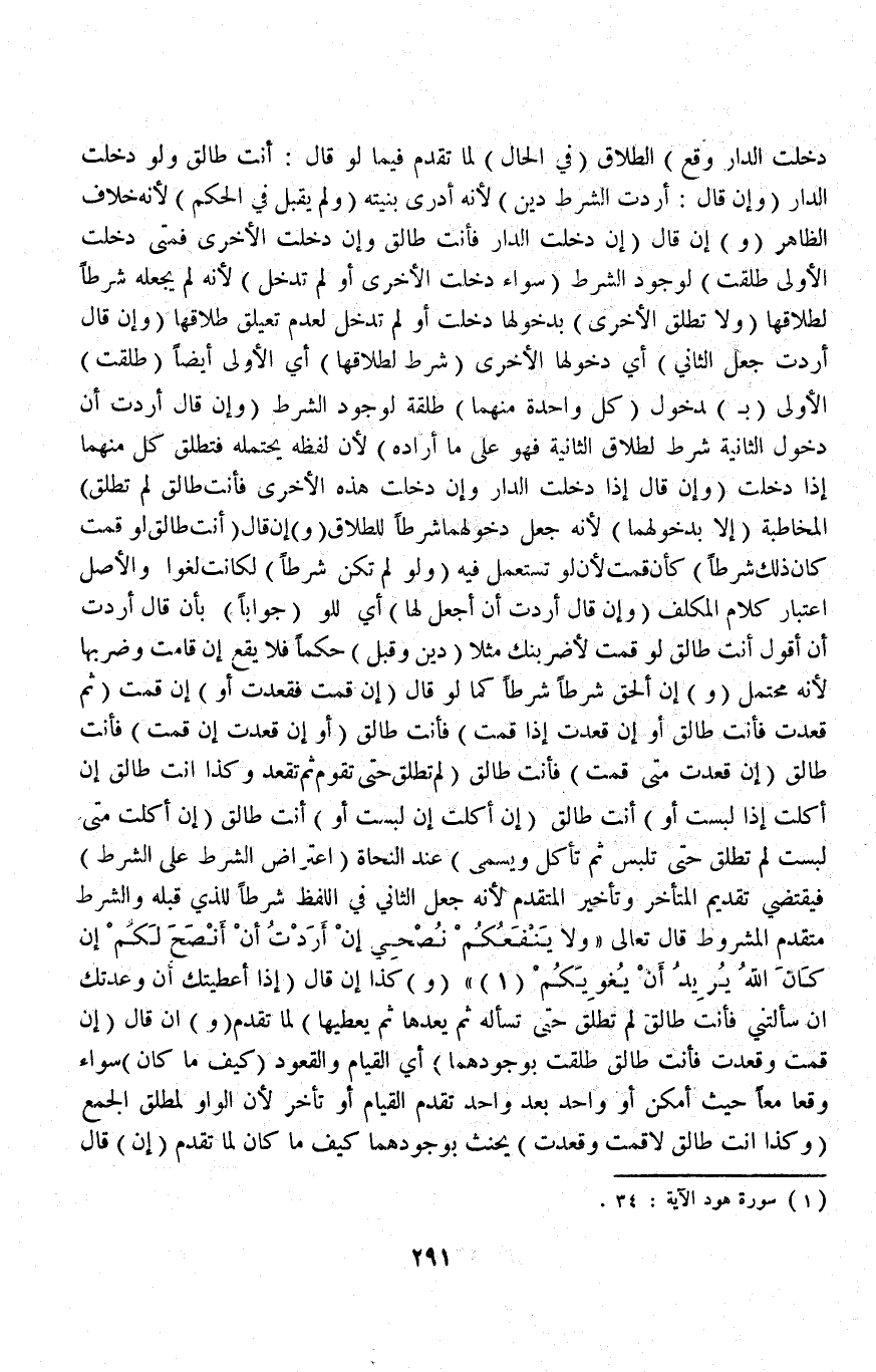 (وَ) إنْ أَلْحَق شَرَطًا شَرْطًا كَمَا لَوْ قَالَ (إنْ قُمْتِ فَقَعَدَتْ أَوْ) إنْ قُمْتِ (ثُمَّ قَعَدْتِ فَأَنْتِ طَالِقٌ أَوْ إنْ قَعَدْتِ إذَا قُمْتِ) فَأَنْتِ طَالِقٌ (أَوْ إنْ قَعَدْتِ إنْ قُمْتِ) فَأَنْتِ طَالِقٌ (إنْ قَعَدْتِ مَتَى قُمْتِ) فَأَنْتِ طَالِقٌ (لَمْ تَطْلُقْ حَتَّى تَقُومَ ثُمَّ تَقْعُدُ وَكَذَا أَنْتِ طَالِقٌ إنْ أَكَلْتِ إذَا لَبِسْتِ أَوْ) أَنْتِ طَالِقٌ (إنْ أَكَلْتِ إنْ لَبِسْتِ أَوْ) أَنْتِ طَالِقٌ (إنْ أَكَلْتِ مَتَى لَبِسْتِ لَمْ تَطْلُقْ حَتَّى تَلْبَسَ ثُمَّ تَأْكُلَ وَيُسَمَّى) عِنْد النُّحَاةِ (اعْتِرَاضُ الشَّرْطِ عَلَى الشَّرْط) فَيَقْتَضِي تَقْدِيمَ الْمُتَأَخِّرِ وَتَأْخِيرَ الْمُتَقَدِّمِ لِأَنَّهُ جَعَلَ الثَّانِي فِي اللَّفْظِ شَرْطًا لِلَّذِي قَبْلَهُ وَالشَّرْطُ مُتَقَدِّمٌ الْمَشْرُوطَ قَالَ تَعَالَى {وَلا يَنْفَعُكُمْ نُصْحِي إِنْ أَرَدْتُ أَنْ أَنْصَحَ لَكُمْ إِنْ كَانَ اللَّهُ يُرِيدُ أَنْ يُغْوِيَكُمْ} [هود: ٣٤] (و) كَذَا إنْ قَالَ (إذَا أَعْطَيْتُكِ إنْ وَعَدْتُكِ إنْ سَأَلْتِينِي فَأَنْتِ طَالِقٌ لَمْ تَطْلُقْ حَتَّى تَسْأَلَهُ ثُمَّ يَعِدَهَا ثُمَّ يُعْطِيَهَا) لِمَا تَقَدَّمَ.