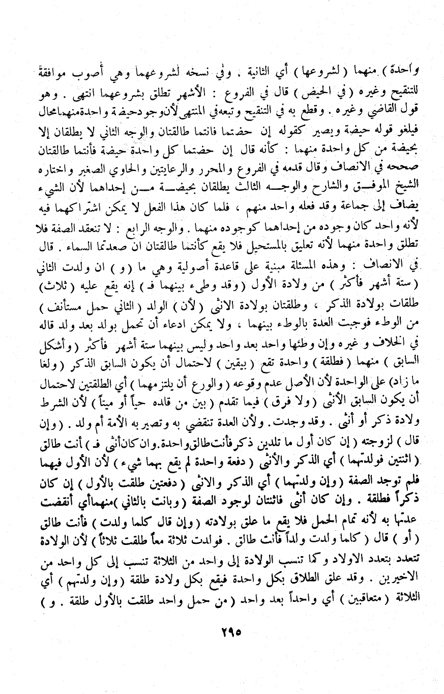 صَحَّحَهُ فِي الْإِنْصَافِ وَقَالَ: قَدَّمَهُ فِي الْفُرُوعِ وَالْمُحَرَّرِ وَالرِّعَايَتَيْنِ وَالْحَاوِي الصَّغِيرِ وَاخْتَارَهُ الشَّيْخُ الْمُوَفَّقُ وَالشَّارِحُ وَالْوَجْهُ الثَّالِثُ: يُطَلَّقَانِ بِحَيْضَةٍ مِنْ إحْدَاهُمَا لِأَنَّ الشَّيْءَ يُضَافُ إلَى جَمَاعَةٍ وَقَدْ فَعَلَهُ وَاحِدٌ مِنْهُمْ، فَلَمَّا كَانَ هَذَا الْفِعْلُ لَا يُمْكِنُ اشْتِرَاكُهُمَا فِيهِ لِأَنَّهُ وَاحِدٌ كَانَ وُجُودُهُ مِنْ إحْدَاهُمَا كَوُجُودِهِ مِنْهُمَا وَالْوَجْهُ الرَّابِعُ لَا تَنْعَقِدُ الصِّفَةُ فَلَا تَطْلُقْ وَاحِدَةٌ مِنْهُمَا لِأَنَّهُ تَعْلِيقٌ بِالْمُسْتَحِيلِ فَلَا يَقَعُ كَأَنْتُمَا طَالِقَتَانِ إنْ صَعَدْتُمَا السَّمَاءَ قَالَ فِي الْإِنْصَافِ: وَهَذِهِ الْمَسْأَلَةُ مَبْنِيَّةٌ عَلَى قَاعِدَةٍ أُصُولِيَّةٍ وَهِيَ مَا.