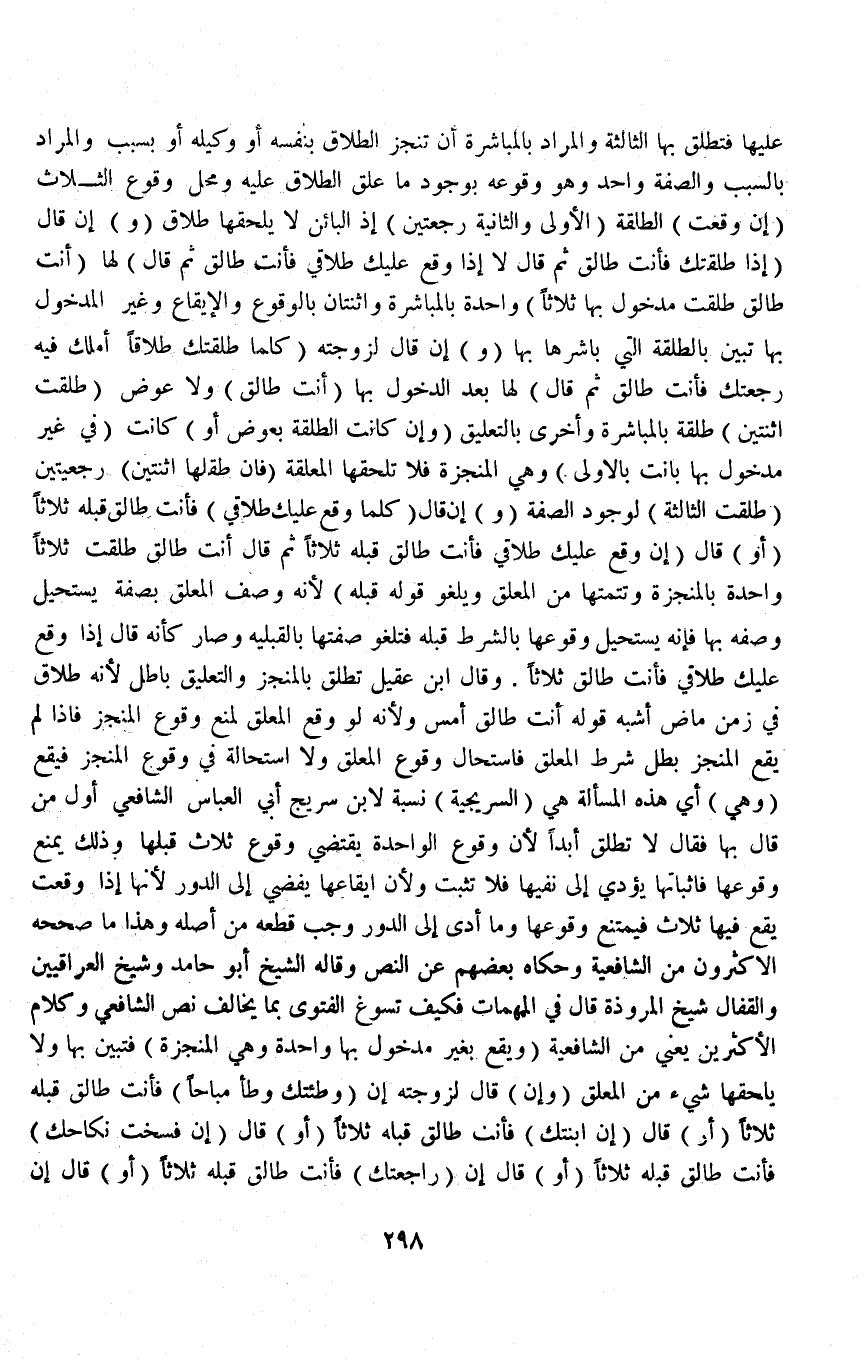 وَقَالَ ابْنُ عَقِيلٍ تَطْلُقُ بِالْمُنَجَّزِ وَالتَّعْلِيقُ بَاطِلٌ لِأَنَّهُ طَلَاقٌ فِي زَمَنٍ مَاضٍ أَشْبَهَ قَوْلَهُ أَنْتِ طَالِقٌ أَمْسِ وَلِأَنَّهُ لَوْ وَقَعَ الْمُعَلَّقُ لَمَنَعَ وُقُوعَ الْمُنَجَّزِ فَإِذَا لَمْ يَقَعْ الْمُنَجَّزُ بَطَلَ شَرْطُ الْمُعَلَّقِ فَاسْتَحَالَ وُقُوعُ الْمُعَلَّقِ وَلَا اسْتِحَالَةَ فِي وُقُوعِ الْمُنَجَّزِ فَيَقَعُ (وَهِيَ) أَيْ هَذِهِ الْمَسْأَلَةُ هِيَ (السُّرَيْجِيَّةُ) نِسْبَةً لِابْنِ سُرَيْجِ أَبِي الْعَبَّاسِ الشَّافِعِيِّ أَوَّل مَنْ قَالَ بِهَا فَقَالَ لَا تَطْلُقُ أَبَدًا لِأَنَّ وُقُوعَ الْوَاحِدَةِ يَقْتَضِي وُقُوعَ ثَلَاثٍ قَبْلَهَا وَذَلِكَ يَمْنَعُ وُقُوعَهَا فَإِثْبَاتُهَا يُؤَدِّي إلَى نَفْيِهَا فَلَا تَثْبُتُ وَلِأَنَّ إيقَاعَهَا يُفْضِي إلَى الدَّوْرِ لِأَنَّهَا إذَا وَقَعَتْ يَقَعُ فِيهَا ثَلَاثٌ فَيَمْتَنِعُ وُقُوعُهَا وَمَا أَدَّى إلَى الدَّوْرِ وَجَبَ قَطْعُهُ مِنْ أَصْلِهِ وَهَذَا مَا صَحَّحَهُ الْأَكْثَرُونَ مِنْ الشَّافِعِيَّةِ وَحَكَاهُ بَعْضُهُمْ عَنْ النَّصِّ.