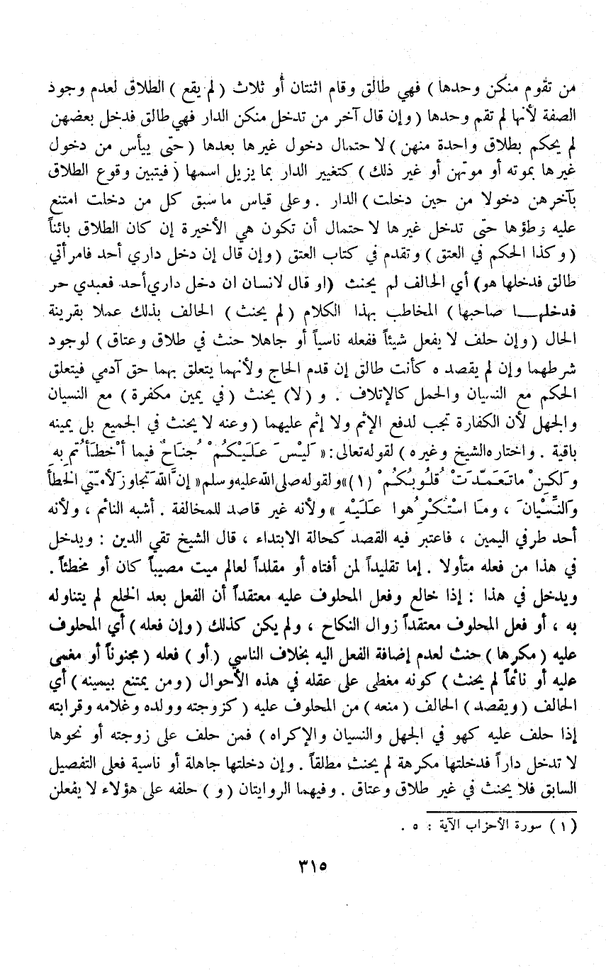 (وَإِنْ حَلَفَ لَا يَفْعَلُ شَيْئًا فَفَعَلَهُ نَاسِيًا أَوْ جَاهِلًا حَنِثَ فِي طَلَاقٍ وَعَتَاقٍ) لِوُجُودِ شَرْطِهِمَا وَإِنْ لَمْ يَقْصِدْهُ كَانَتْ طَالِقٌ إنْ قَدِمَ الْحَاجُّ وَلِأَنَّهُمَا يَتَعَلَّقُ بِهِمَا حَقُّ آدَمِيٍّ فَيَتَعَلَّقُ الْحُكْمُ مَعَ النِّسْيَانِ وَالْحَمْلِ كَالْإِتْلَافِ و (لَا) يَحْنَثُ (فِي يَمِينٍ مُكَفِّرَةٍ) مَعَ النِّسْيَانِ وَالْجَهْلِ لِأَنَّ الْكَفَّارَةَ تَجِبُ لِدَفْعِ الْإِثْمِ وَلَا إثْمَ عَلَيْهِمَا (وَعَنْهُ لَا يَحْنَثُ فِي الْجَمِيعِ بَلْ يَمِينُهُ بَاقِيَةٌ وَاخْتَارَهُ الشَّيْخُ وَغَيْرُهُ) لِقَوْلِهِ تَعَالَى: {وَلَيْسَ عَلَيْكُمْ جُنَاحٌ فِيمَا أَخْطَأْتُمْ بِهِ وَلَكِنْ مَا تَعَمَّدَتْ قُلُوبُكُمْ} [الأحزاب: ٥] وَلِقَوْلِهِ - صَلَّى اللَّهُ عَلَيْهِ وَسَلَّمَ - «إنَّ اللَّهَ تَجَاوَزَ لِأُمَّتِي الْخَطَأَ وَالنِّسْيَانَ، وَمَا اُسْتُكْرِهُوا عَلَيْهِ» .