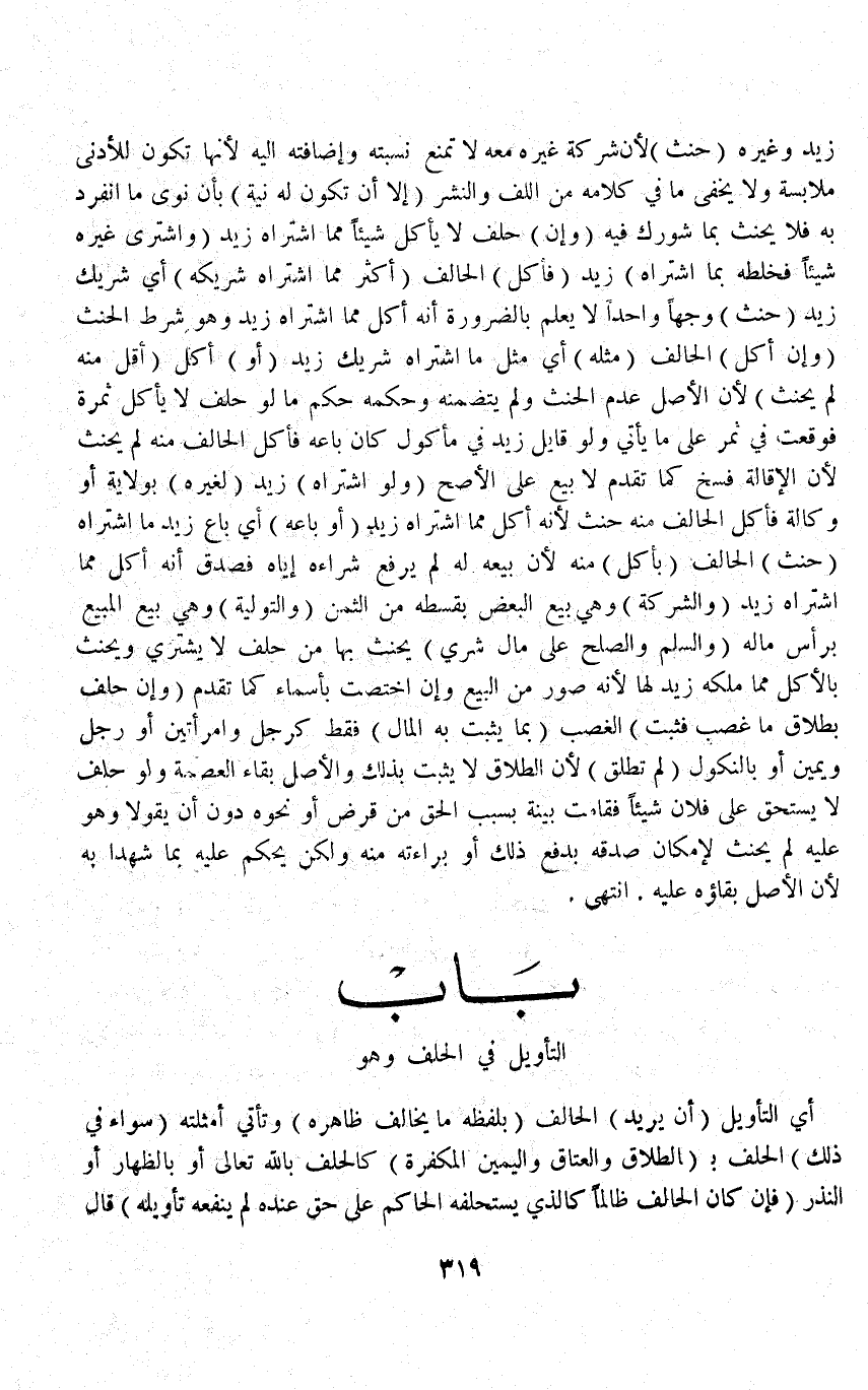(بَابُ التَّأْوِيلِ فِي الْحَلِفِ وَهُوَ) أَيْ التَّأْوِيلُ (أَنْ يُرِيدَ) الْحَالِفُ (بِلَفْظِهِ مَا يُخَالِفُ ظَاهِرَهُ) وَتَأْتِي أَمْثِلَتُهُ (سَوَاءٌ، فِي ذَلِكَ) الْحَلِفُ بِ (الطَّلَاقِ وَالْعَتَاقِ وَالْيَمِينِ الْمُكَفِّرَةِ) كَالْحَلِفِ بِاَللَّهِ تَعَالَى أَوْ بِالظِّهَارِ أَوْ النَّذْرِ (فَإِنْ كَانَ الْحَالِفُ ظَالِمًا كَاَلَّذِي يَسْتَحْلِفُهُ الْحَاكِمُ عَلَى حَقٍّ عِنْدَهُ لَمْ يَنْفَعْهُ تَأْوِيلُهُ) قَالَ