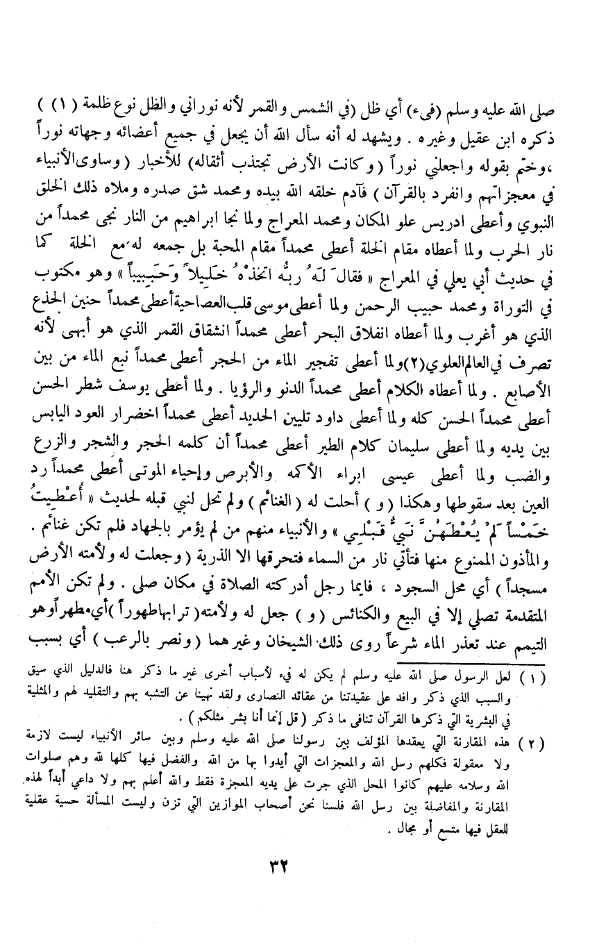 - صَلَّى اللَّهُ عَلَيْهِ وَسَلَّمَ - (فَيْءٌ) أَيْ ظِلٌّ (فِي الشَّمْسِ وَالْقَمَرِ لِأَنَّهُ نُورَانِيُّ وَالظِّلُّ نَوْعُ ظُلْمَةٍ) ذَكَرَهُ ابْنُ عَقِيلٍ وَغَيْرُهُ وَيَشْهَد لَهُ أَنَّهُ سَأَلَ اللَّهَ أَنْ يَجْعَلَ فِي جَمِيعِ أَعْضَائِهِ وَجِهَاتِهِ نُورًا، وَخَتَمَ بِقَوْلِهِ وَاجْعَلْنِي نُورًا (وَكَانَتْ الْأَرْضُ تَجْتَذِبُ أَثْقَالَهُ) لِلْأَخْبَارِ (وَسَاوَى الْأَنْبِيَاءَ فِي مُعْجِزَاتِهِمْ وَانْفَرَدَ بِالْقُرْآنِ) فَآدَمُ خَلَقَهُ اللَّهُ بِيَدِهِ وَمُحَمَّدٌ شَقَّ صَدْرَهُ وَمَلَأَهُ ذَلِكَ الْخُلُقَ النَّبَوِيَّ وَأُعْطِيَ إدْرِيسُ عُلُوَّ الْمَكَانِ وَمُحَمَّدٌ الْمِعْرَاجَ وَلَمَّا نَجَا إبْرَاهِيمُ مِنْ النَّارِ نَجَّى مُحَمَّدًا مِنْ نَارِ الْحَرْبِ.