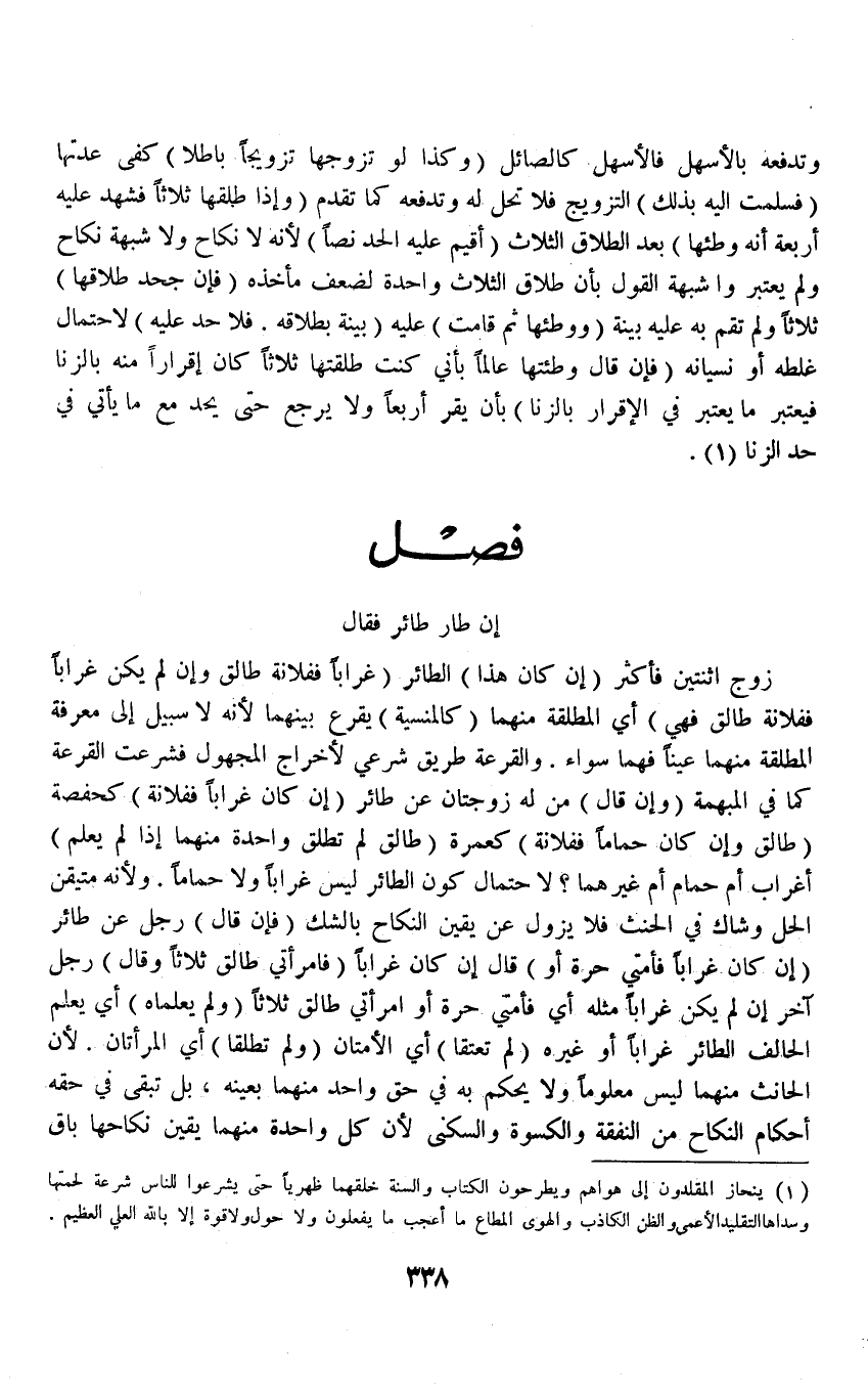 (فَصْلٌ إنْ طَارَ طَائِرٌ فَقَالَ) زَوْجُ اثْنَتَيْنِ فَأَكْثَرَ (إنْ كَانَ هَذَا) الطَّائِرُ (غُرَابًا فَفُلَانَةٌ طَالِقٌ وَإِنْ لَمْ يَكُنْ غُرَابًا فَفُلَانَةٌ طَالِقٌ فَهِيَ) أَيْ الْمُطَلَّقَةُ مِنْهُمَا (كَالْمَنْسِيَّةِ) يُقْرَعُ بَيْنَهُمَا لِأَنَّهُ لَا سَبِيلَ إلَى مَعْرِفَةِ الْمُطَلَّقَةِ مِنْهُمَا عَيْنًا فَهُمَا سَوَاءٌ وَالْقُرْعَةُ طَرِيقٌ شَرْعِيٌّ لِإِخْرَاجِ الْمَجْهُولِ فَشُرِعَتْ الْقُرْعَةُ كَمَا فِي الْمُبْهَمَةِ.