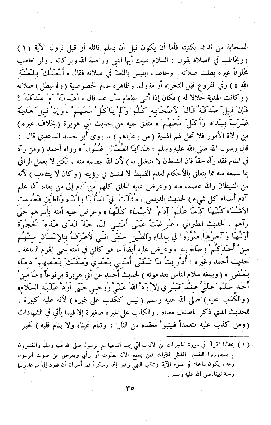 (وَمَنْ رَآهُ فِي الْمَنَامِ فَقَدْ رَآهُ حَقًّا فَإِنَّ الشَّيْطَانَ لَا يَتَخَيَّلُ بِهِ) لِأَنَّ اللَّهَ عَصَمَهُ مِنْهُ لَكِنْ لَا يَعْمَلُ الرَّائِي بِمَا سَمِعَهُ مِنْهُ مِمَّا يَتَعَلَّقُ بِالْأَحْكَامِ لِعَدَمِ الضَّبْطِ لَا لِلشَّكِّ فِي رُؤْيَتِهِ (وَكَانَ لَا يَتَثَاءَبُ) لِأَنَّهُ مِنْ الشَّيْطَانِ وَاَللَّهُ عَصَمَهُ مِنْهُ (وَعُرِضَ عَلَيْهِ الْخَلْقُ كُلُّهُمْ مِنْ آدَمَ إلَى مَنْ بَعْدَهُ كَمَا عَلَّمَ آدَمَ أَسْمَاءَ كُلِّ شَيْءٍ) لِحَدِيثِ الدَّيْلَمِيِّ «مُثِّلَتْ لِي الدُّنْيَا بِالْمَاءِ وَالطِّينِ فَعُلِّمْتُ الْأَشْيَاءَ كُلَّهَا كَمَا عُلِّمَ آدَم الْأَسْمَاءَ كُلَّهَا» وَعُرِضَ عَلَيْهِ أُمَّتُهُ بِأَسْرِهِمْ حَتَّى رَآهُمْ لِحَدِيثِ الطَّبَرَانِيِّ «عُرِضَتْ عَلَيَّ أُمَّتِي الْبَارِحَةَ لَدَى هَذِهِ الْحُجْرَةِ أَوَّلُهَا وَآخِرُهَا صُوِّرُوا لِي بِالْمَاءِ وَالطِّينِ حَتَّى إنِّي لَأَعْرَفُ بِالْإِنْسَانِ مِنْهُمْ مِنْ أَحَدِكُمْ بِصَاحِبِهِ» وَعُرِضَ عَلَيْهِ أَيْضًا مَا هُوَ كَائِن فِي أُمَّتِهِ حَتَّى تَقُومَ السَّاعَةُ لِحَدِيثِ أَحْمَدَ وَغَيْرِهِ «أُدْرِيتُ مَا تَلْقَى أُمَّتِي بَعْدِي وَسَفْكَ بَعْضِهِمْ دِمَاءَ بَعْضٍ» (وَيَبْلُغُهُ سَلَامُ النَّاسِ بَعْدَ مَوْتِهِ) لِحَدِيثِ أَحْمَدَ عَنْ أَبِي هُرَيْرَةَ مَرْفُوعًا «مَا مِنْ أَحَدٍ سَلَّمَ عَلَيَّ عِنْدَ قَبْرِي إلَّا رَدَّ اللَّهُ عَلَيَّ رُوحِي حَتَّى أَرُدَّ عَلَيْهِ السَّلَامَ» .