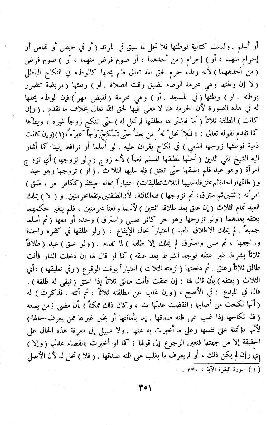 (وَإِنْ كَانَتْ) الْمُطَلَّقَةُ ثَلَاثًا (أَمَةً فَاشْتَرَاهَا مُطَلِّقُهَا لَمْ تَحِلَّ لَهُ) حَتَّى تَنْكِحَ زَوْجًا غَيْرَهُ وَيَطَأُهَا كَمَا تَقَدَّمَ لِقَوْلِهِ تَعَالَى: {فَلا تَحِلُّ لَهُ مِنْ بَعْدُ حَتَّى تَنْكِحَ زَوْجًا غَيْرَهُ} [البقرة: ٢٣٠] .