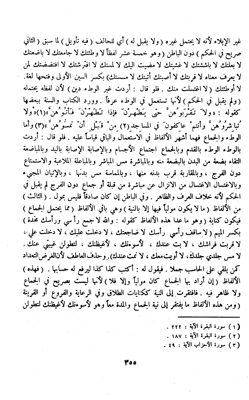 (وَلَا يُقْبَلُ لَهُ) أَيْ لِلْحَالِفِ (فِيهِ تَأْوِيلٌ) لِمَا سَبَقَ (الثَّانِي صَرِيحٌ فِي الْحُكْمِ) دُونَ الْبَاطِنِ (وَهُوَ خَمْسَةَ عَشَرَ لَفْظًا لَا وَطِئْتُكِ لَا جَامَعْتُكِ لَا بَاضَعْتُكِ لَا بَعَلْتُكِ لَا بَاشَشْتُكِ لَا غَشَيْتُكِ لَا مَضَيْتُ إلَيْكِ لَا لَمَسْتُكِ لَا افْتَرَشْتُكِ لَا افْتَضَضْتُكِ لِمَنْ لَا يَعْرِفَ مَعْنَاهُ لَا قَرَبْتُكِ لَا أَصَبْتُكِ أَتَيْتُكِ لَا مَسِسْتُكِ) بِكَسْرِ السِّينِ الْأُولَى وَفَتْحُهَا لُغَةٌ لَا أَوْطَئْتُكِ (لَا اغْتَسَلْتُ مِنْكِ فَلَوْ قَالَ أَرَدْتُ غَيْرَ الْوَطْءِ دِينَ) لِأَنَّ لَفْظَهُ يَحْتَمِلُهُ وَلَمْ يُقْبَلْ فِي الْحُكْمِ لِأَنَّهَا تُسْتَعْمَلُ فِي الْوَطْءِ عُرْفًا وَوَرَدَ الْكِتَابُ وَالسُّنَّةُ بِبَعْضِهَا كَقَوْلِهِ: {وَلا تَقْرَبُوهُنَّ حَتَّى يَطْهُرْنَ فَإِذَا تَطَهَّرْنَ فَأْتُوهُنَّ} [البقرة: ٢٢٢] {وَلا تُبَاشِرُوهُنَّ وَأَنْتُمْ عَاكِفُونَ فِي الْمَسَاجِدِ} [البقرة: ١٨٧] {مِنْ قَبْلِ أَنْ تَمَسُّوهُنَّ} [البقرة: ٢٣٧] وَأَمَّا الْوَطْءُ وَالْجِمَاعُ فَهُمَا أَشْهَرُ الْأَلْفَاظِ فِي الِاسْتِعْمَالِ وَالْبَاقِي قِيَاسًا عَلَيْهِ.
