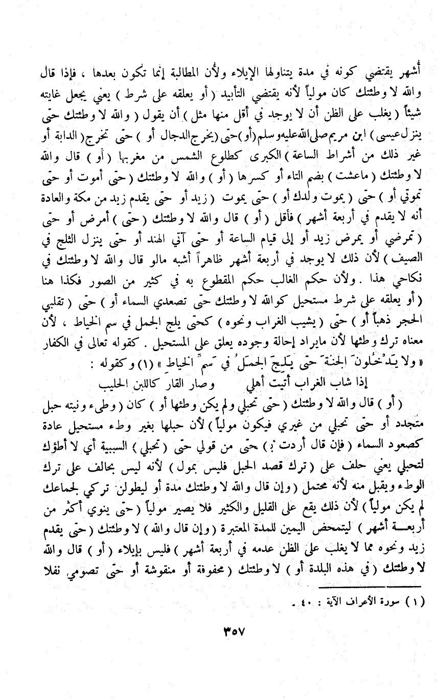 (أَوْ يُعَلِّقهُ عَلَى شَرْطٍ مُسْتَحِيلٍ كَوَاللَّهِ لَا وَطِئْتُكِ حَتَّى تَصْعَدِي السَّمَاء أَوْ) حَتَّى (تَقْلِبِي الْحَجَر ذَهَبًا أَوْ) حَتَّى (يَشِيبَ الْغُرَابُ وَنَحْوَهُ) كَحَتَّى يَلِجَ الْجَمَلُ فِي سَمِّ الْخِيَاطِ لِأَنَّ مَعْنَاهُ تَرْكُ وَطْئِهَا لِأَنَّ مَا يُرَادُ إحَالَةُ وُجُودِهِ يُعَلَّقُ عَلَى الْمُسْتَحِيلِ كَقَوْلِهِ تَعَالَى فِي الْكُفَّارِ {وَلا يَدْخُلُونَ الْجَنَّةَ حَتَّى يَلِجَ الْجَمَلُ فِي سَمِّ الْخِيَاطِ} [الأعراف: ٤٠] وَكَقَوْلِهِ: