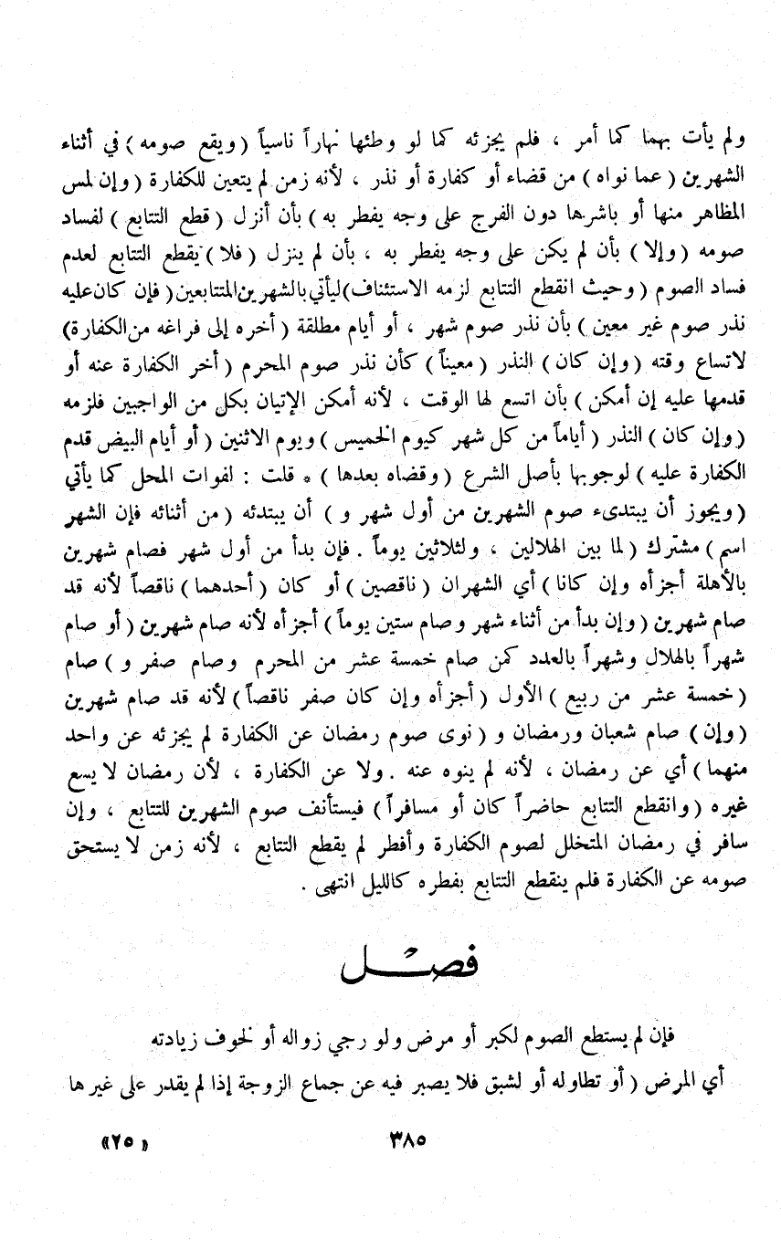 فَصْل فَإِنْ لَمْ يَسْتَطِعْ الصَّوْمَ لِكِبَرٍ أَوْ مَرَضٍ وَلَوْ رُجِيَ زَوَالُهُ أَوْ لِخَوْفٍ زِيَادَتِهِ أَيْ الْمَرَضِ (أَوْ تَطَاوَلَهُ أَوْ لِشَبَقٍ فَلَا يَصْبِر فِيهِ عَنْ جِمَاعِ الزَّوْجَةِ إذَا لَمْ يَقْدِر عَلَى غَيْرِهَا