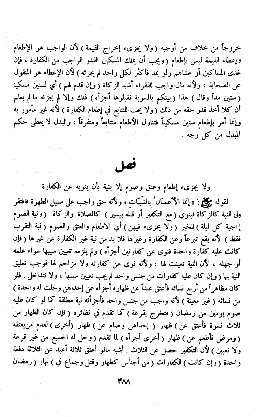 فَصْل وَلَا يُجْزِئُ إطْعَامٌ وَعِتْقٌ وَصَوْمٌ إلَّا بِنِيَّةٍ بِأَنْ يَنْوِيَهُ عَنْ الْكَفَّارَةِ لِقَوْلِهِ - صَلَّى اللَّهُ عَلَيْهِ وَسَلَّمَ - «إنَّمَا الْأَعْمَالُ بِالنِّيَّاتِ» وَلِأَنَّهُ حَقٌّ وَاجِبٌ عَلَى سَبِيلِ الطُّهْرَةِ فَافْتَقَرَ إلَى النِّيَّةِ كَالزَّكَاةِ فَيَنْوِي (مَعَ التَّكْفِيرِ أَوْ قَبْلِهِ بِيَسِيرٍ) كَالصَّلَاةِ وَالزَّكَاةِ (وَنِيَّةُ الصَّوْمِ وَاجِبَةٌ كُلَّ لَيْلَةٍ) لِلْخَبَرِ (وَلَا يُجْزِئُ فِيهِنَّ) أَيْ الْإِطْعَامِ وَالْعِتْقِ وَالصَّوْمِ (نِيَّةٌ التَّقَرُّبِ فَقَطْ) لِأَنَّهُ يَقَعُ تَبَرُّعًا وَعَنْ الْكَفَّارَةِ وَغَيْرِهَا فَلَا بُدّ مِنْ نِيَّةٍ غَيْرَ الْكَفَّارَةِ عَنْ غَيْرِهَا (فَإِنْ كَانَتْ عَلَيْهِ كَفَّارَةٌ وَاحِدَةٌ فَنَوَى عَنْ كَفَّارَتَيْنِ أَجْزَأَهُ) وَلَمْ يَلْزَمْهُ تَعْيِينُ سَبَبِهَا سَوَاءٌ عَلِمَهُ أَوْ جَهِلَهُ، لِأَنَّ النِّيَّةَ تَعَيَّنَتْ لَهَا، وَلِأَنَّهُ نَوَى عَنْ كَفَّارَتِهِ وَلَا مُزَاحِمَ لَهَا فَوَجَبَ تَعْلِيقُ النِّيَّةَ بِهَا (وَإِنْ كَانَ عَلَيْهِ كَفَّارَاتٌ مِنْ جِنْسٍ وَاحِدٍ لَمْ يَجِبْ تَعْيِينُ سَبَبِهَا، وَلَا تَتَدَاخَلْ فَلَوْ كَانَ مُظَاهِرًا مِنْ أَرْبَعِ نِسَائِهِ فَأَعْتَقَ عَبْدًا عَنْ ظِهَارِهِ أَجْزَأَهُ عَنْ إحْدَاهُنَّ وَحَلَّتْ لَهُ وَاحِدَةٌ) .