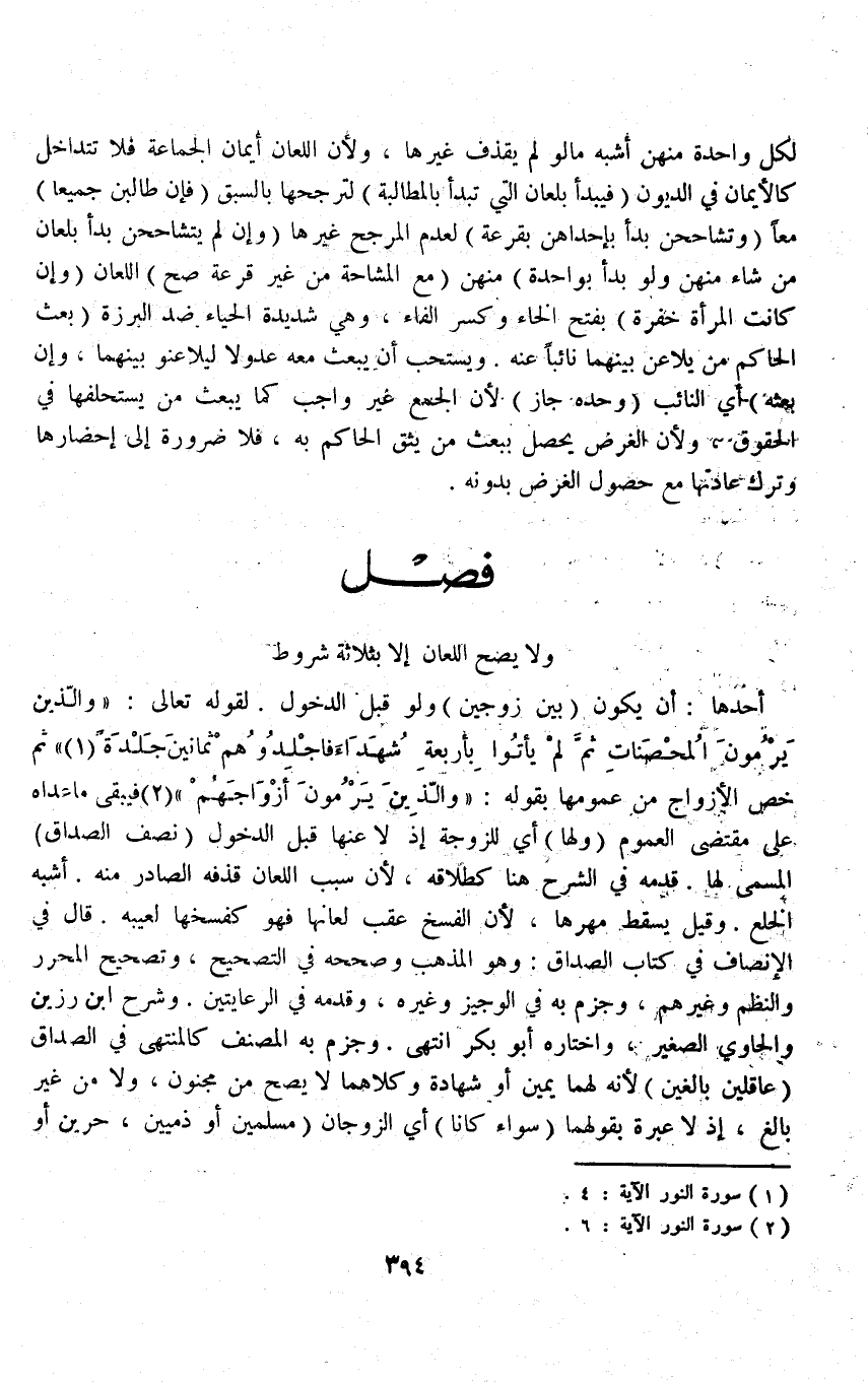 فَصْل وَلَا يَصِحُّ اللِّعَانُ إلَّا بِثَلَاثَةِ شُرُوطٍ أَحَدُهَا: أَنْ يَكُونَ (بَيْنَ زَوْجَيْنِ) وَلَوْ قَبْلَ الدُّخُولِ لِقَوْلِهِ تَعَالَى: {وَالَّذِينَ يَرْمُونَ الْمُحْصَنَاتِ ثُمَّ لَمْ يَأْتُوا بِأَرْبَعَةِ شُهَدَاءَ فَاجْلِدُوهُمْ ثَمَانِينَ جَلْدَةً} [النور: ٤] ثُمَّ خَصَّ الْأَزْوَاجَ مِنْ عُمُومِهَا بِقَوْلِهِ: {وَالَّذِينَ يَرْمُونَ أَزْوَاجَهُمْ} [النور: ٦] فَيَبْقَى مَا عَدَاهُ عَلَى مُقْتَضَى الْعُمُومِ (وَلَهَا) أَيْ لِلزَّوْجَةِ إذَا لَاعَنَهَا زَوْجُهَا قَبْلَ الدُّخُولِ (نِصْفُ الصَّدَاقِ) الْمُسَمَّى لَهَا قَدَّمَهُ فِي الشَّرْحِ هُنَا كَطَلَاقِهِ، لِأَنَّ سَبَبَ اللِّعَانِ قَذْفُهُ الصَّادِرُ مِنْهُ أَشْبَهَ الْخُلْعَ وَقِيلَ يَسْقُطُ مَهْرُهَا، لِأَنَّ الْفَسْخَ عَقِبَ لِعَانِهَا فَهُوَ كَفَسْخِهَا لِعَيْبِهِ.