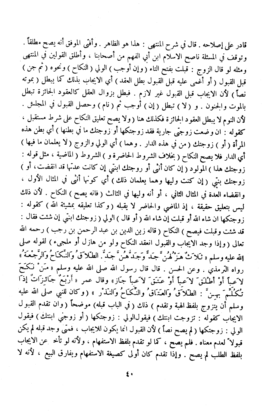 قَادِرٍ عَلَى إصْلَاحِهِ قَالَ فِي شَرْحِ الْمُنْتَهَى: هَذَا هُوَ الظَّاهِرُ وَأَفْتَى الْمُوَفَّقُ أَنَّهُ يَصِحُّ مُطْلَقًا وَتَوَقَّفَ فِي الْمَسْأَلَةِ نَاصِحُ الْإِسْلَامِ ابْنُ أَبِي الْفَهْمِ مِنْ أَصْحَابِنَا وَأَطْلَقَ الْقَوْلَيْنِ فِي الْمُنْتَهَى وَمِثْلُهُ لَوْ قَالَ الزَّوْجُ: قَبِلْتَ بِفَتْحِ التَّاءِ.