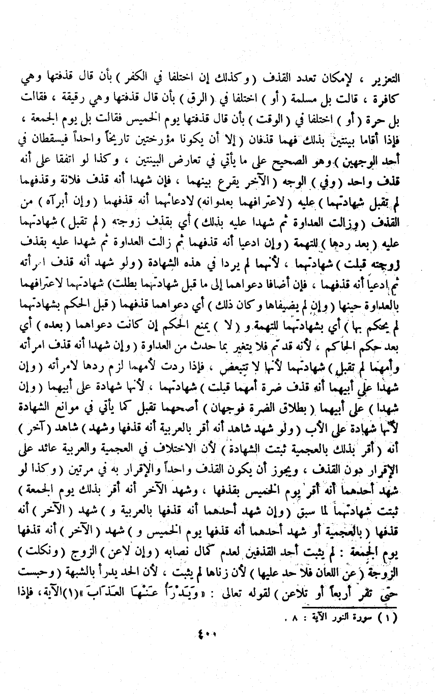 التَّعْزِيرُ، لِإِمْكَانِ تَعَدُّدِ الْقَذْفِ (وَكَذَلِكَ إنْ اخْتَلَفَا فِي الْكُفْرِ) بِأَنْ قَالَ قَذَفْتُهَا وَهِيَ كَافِرَةٌ، قَالَتْ بَلْ مُسْلِمَةٌ (أَوْ) اخْتَلَفَا فِي (الرِّقِّ) بِأَنْ قَالَ قَذَفْتُهَا وَهِيَ رَقِيقَةٌ، فَقَالَتْ بَلْ حُرَّةٌ (أَوْ) اخْتَلَفَا فِي (الْوَقْتِ) بِأَنْ قَالَ قَذَفْتُهَا يَوْم الْخَمِيسِ فَقَالَتْ بَلْ، يَوْمَ الْجُمُعَةِ، فَإِذَا أَقَامَا بَيِّنَتَيْنِ بِذَلِكَ فَهُمَا قَذْفَانِ (إلَّا أَنْ يَكُونَا مُؤَرِّخَتَيْنِ تَارِيخًا وَاحِدًا فَيُسْقَطَانِ فِي أَحَد الْوَجْهَيْنِ) وَهُوَ الصَّحِيحُ عَلَى مَا يَأْتِي فِي تَعَارُضِ الْبَيِّنَتَيْنِ، وَكَذَا لَوْ اتَّفَقَا عَلَى أَنَّهُ قَذْفٌ وَاحِدٌ (وَفِي) الْوَجْهِ الْآخَرِ يُقْرَعُ بَيْنَهُمَا،.