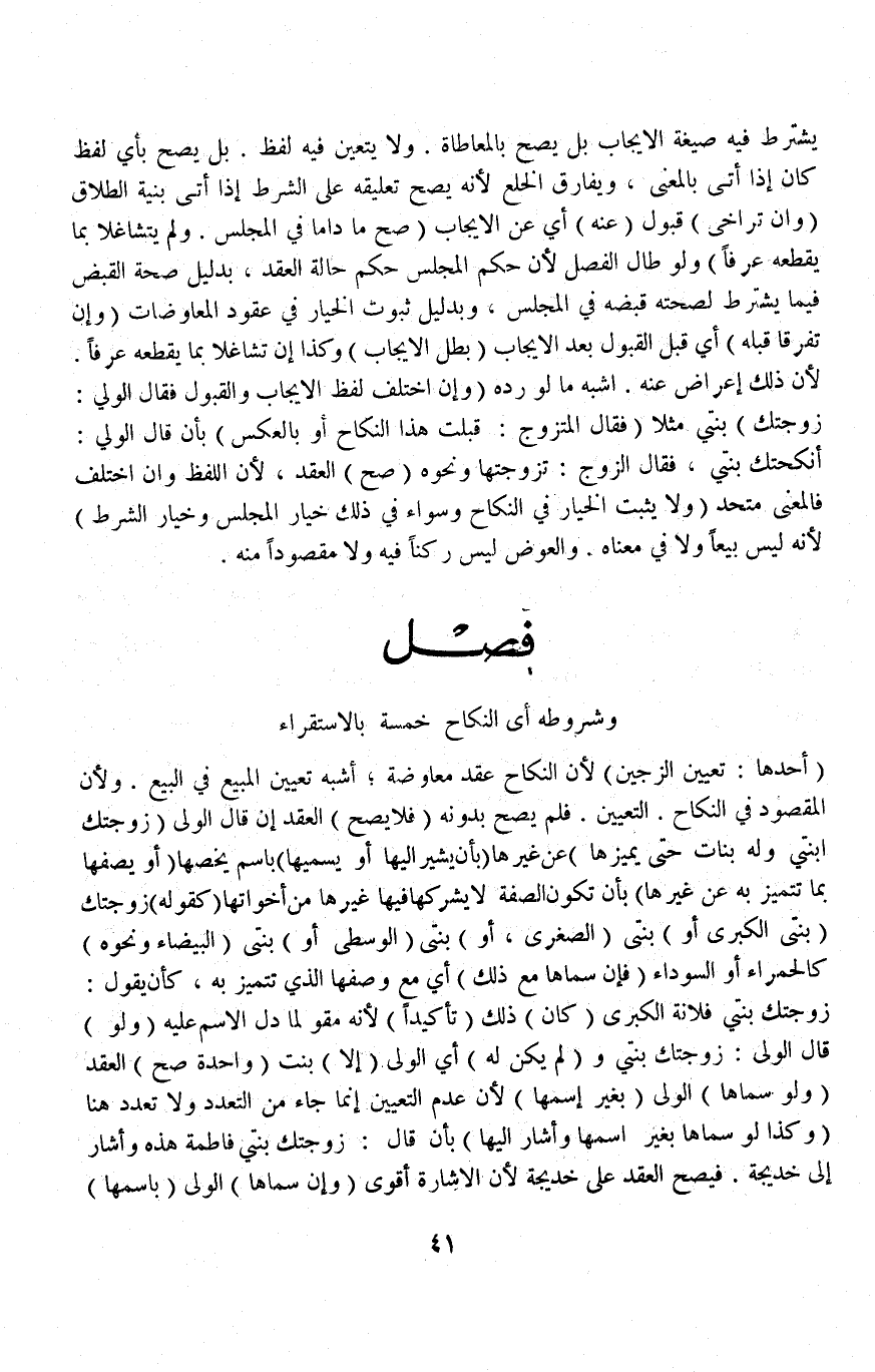 فَصْلٌ وَشُرُوطُهُ أَيْ النِّكَاحُ خَمْسَةٌ بِالِاسْتِقْرَاءِ (أَحَدُهَا: تَعْيِينُ الزَّوْجَيْنِ) لِأَنَّ النِّكَاحَ عَقْدُ مُعَاوَضَةٍ أَشْبَهَ تَعْيِين الْمَبِيعِ فِي الْبَيْعِ وَلِأَنَّ الْمَقْصُودَ فِي النِّكَاحِ التَّعْيِينُ فَلَمْ يَصِحُّ بِدُونِهِ (فَلَا يَصِحُّ) الْعَقْدُ إنْ قَالَ الْوَلِيُّ (زَوَّجْتُك ابْنَتِي وَلَهُ بَنَاتٌ حَتَّى يُمَيِّزَهَا) عَنْ غَيْرِهَا (بِأَنْ يُشِيرَ إلَيْهَا أَوْ يُسَمِّيَهَا) بِاسْمٍ يَخُصُّهَا (أَوْ يَصِفُهَا بِمَا تَتَمَيَّزُ بِهِ عَنْ غَيْرِهَا) بِأَنْ تَكُونَ الصِّفَةُ لَا يُشْرِكُهَا فِيهَا غَيْرُهَا مِنْ أَخَوَاتِهَا (كَقَوْلِهِ) زَوَّجْتُكَ بِنْتِي (الْكُبْرَى أَوْ) بِنْتِي (الصُّغْرَى، أَوْ) بِنْتِي (الْوُسْطَى أَوْ) بِنْتِي (الْبَيْضَاء وَنَحْوه) كَالْحَمْرَاءِ أَوْ السَّوْدَاءِ (فَإِنْ سَمَّاهَا مَعَ ذَلِكَ) أَيْ مَعَ وَصْفِهَا الَّذِي تَتَمَيَّزُ بِهِ، كَأَنْ يَقُولَ: زَوَّجْتُكَ بِنْتِي فُلَانَةَ الْكُبْرَى (كَانَ) ذَلِكَ (تَأْكِيدًا) لِأَنَّهُ مُقَوٍّ لِمَا دَلَّ الِاسْمُ عَلَيْهِ.