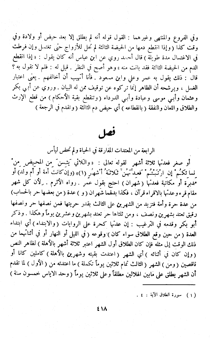 فَصْلٌ الرَّابِعَةُ مِنْ الْمُعْتَدَّاتِ الْمُفَارِقَةُ فِي الْحَيَاةِ وَلَمْ تَحِضْ لِيَأْسٍ أَوْ صِغَرٍ فَعِدَّتُهَا ثَلَاثَةُ أَشْهُرٍ لِقَوْلِهِ تَعَالَى: {وَاللائِي يَئِسْنَ مِنَ الْمَحِيضِ مِنْ نِسَائِكُمْ إِنِ ارْتَبْتُمْ فَعِدَّتُهُنَّ ثَلاثَةُ أَشْهُرٍ} [الطلاق: ٤] (وَإِنْ كَانَتْ أَمَةً أَوْ أُمَّ وَلَدٍ أَوْ مُدَبَّرَةً أَوْ مُكَاتَبَةً فَعِدَّتُهَا (شَهْرَانِ) اُحْتُجَّ بِقَوْلِ عُمَرَ رَوَاهُ الْأَثْرَمُ لِأَنَّ كُلَّ شَهْرٍ مَقَامُ قُرْءٍ وَعِدَّتُهَا بِالْأَقْرَاءِ قُرْءَانِ فَكَذَا بَدَلَهُمَا شَهْرَانِ (وَ) عِدَّةُ مَنْ بَعْضُهَا حُرٌّ بِالْحِسَابِ) مِنْ عِدَّةِ حُرَّةٍ وَأَمَةٍ فَتَزِيدُ مِنْ الشَّهْرَيْنِ عَلَى الثَّالِثِ بِقَدْرِ حُرِّيَّتِهَا فَمَنْ نِصْفُهَا حُرٌّ وَنِصْفُهَا رَقِيقٌ تَعْتَدُّ بِشَهْرَيْنِ وَنِصْفٍ، وَمَنْ ثُلُثَاهَا حُرٌّ تَعْتَدُّ بِشَهْرَيْنِ وَعِشْرِينَ يَوْمًا وَهَكَذَا وَذَكَرَ أَبُو بَكْرٍ وَقَدَّمَهُ فِي التَّرْغِيبِ: أَنَّ عِدَّتَهَا كَحُرَّةٍ عَلَى الرِّوَايَاتِ.