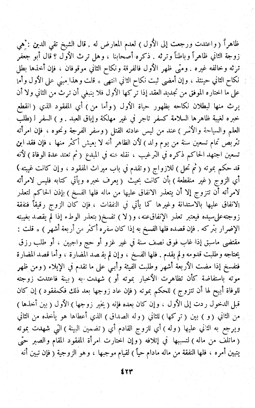 ظَاهِرًا (وَاعْتَدَّتْ وَرَجَعَتْ إلَى الْأَوَّلِ) لِعَدَمِ الْمُعَارِضِ لَهُ قَالَ الشَّيْخُ تَقِيُّ الدِّينِ: هِيَ زَوْجَةُ الثَّانِي ظَاهِرًا وَبَاطِنًا وَتَرِثُهُ ذَكَرَهُ أَصْحَابُنَا وَهَلْ تَرِثُ الْأَوَّلَ؟ قَالَ أَبُو جَعْفَرٍ: تَرِثُهُ وَخَالَفَهُ غَيْرُهُ وَمَتَى ظَهَرَ الْأَوَّلُ فَالْفُرْقَةُ وَنِكَاحُ الثَّانِي مَوْقُوفَانِ، فَإِنْ أَخَذَهَا بَطَلَ نِكَاحُ الثَّانِي حِينَئِذٍ، وَإِنْ أَمْضَى ثَبَتَ نِكَاحُ الثَّانِي انْتَهَى قُلْتُ وَهَذَا مَبْنِيٌّ عَلَى الْأَوَّلِ وَأَمَّا عَلَى مَا اخْتَارَهُ الْمُوَفَّقُ مِنْ تَجْدِيدِ الْعَقْدِ إذَا تَرَكَهَا الْأَوَّلُ فَلَا يَنْبَغِي أَنْ تَرِثَ مِنْ الثَّانِي وَلَا أَنْ يَرِثَ مِنْهَا لِبُطْلَانِ نِكَاحِهِ بِظُهُورِ حَيَاةِ الْأَوَّلِ.