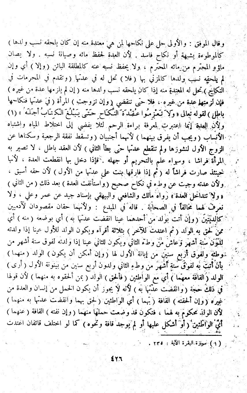 وَقَالَ الْمُوَفَّقُ: وَالْأُولَى حَلَّ عَلَى نِكَاحِهَا لِمَنْ هِيَ مُعْتَدَّةٌ مِنْهُ إنْ كَانَ يَلْحَقُهُ نَسَبُ وَلَدِهَا) كَالْمَوْطُوءَةِ بِشُبْهَةٍ أَوْ نِكَاحٍ فَاسِدٍ لِأَنَّ الْعِدَّةَ لِحِفْظِ مَائِهِ وَصِيَانَةِ نَسَبِهِ وَلَا يُصَانُ مَاؤُهُ الْمُحْتَرَمُ مِنْ مَالِهِ الْمُحْتَرَمِ، وَلَا يُحْفَظُ نَسَبُهُ عَنْهُ كَالْمُطَلَّقَةِ الْبَائِنِ (وَإِلَّا) أَيْ وَإِنْ لَمْ يَلْحَقْهُ نَسَبُ وَلَدِهَا كَالْمَزْنِيِّ بِهَا (فَلَا) تَحِلُّ لَهُ فِي عِدَّتِهَا (وَتَقَدَّمَ فِي الْمُحَرَّمَاتِ فِي النِّكَاحِ) تَحِلُّ لَهُ الْمُعْتَدَّةُ مِنْهُ إذَا كَانَ يَلْحَقُهُ نَسَبُ وَلَدِهَا مِنْهُ (إنْ لَمْ يَلْزَمْهَا عِدَّةٌ مِنْ غَيْرِهِ) فَإِنْ لَزِمَتْهَا عِدَّةٌ مِنْ غَيْرِهِ فَلَا حَتَّى تَنْقَضِيَ.
