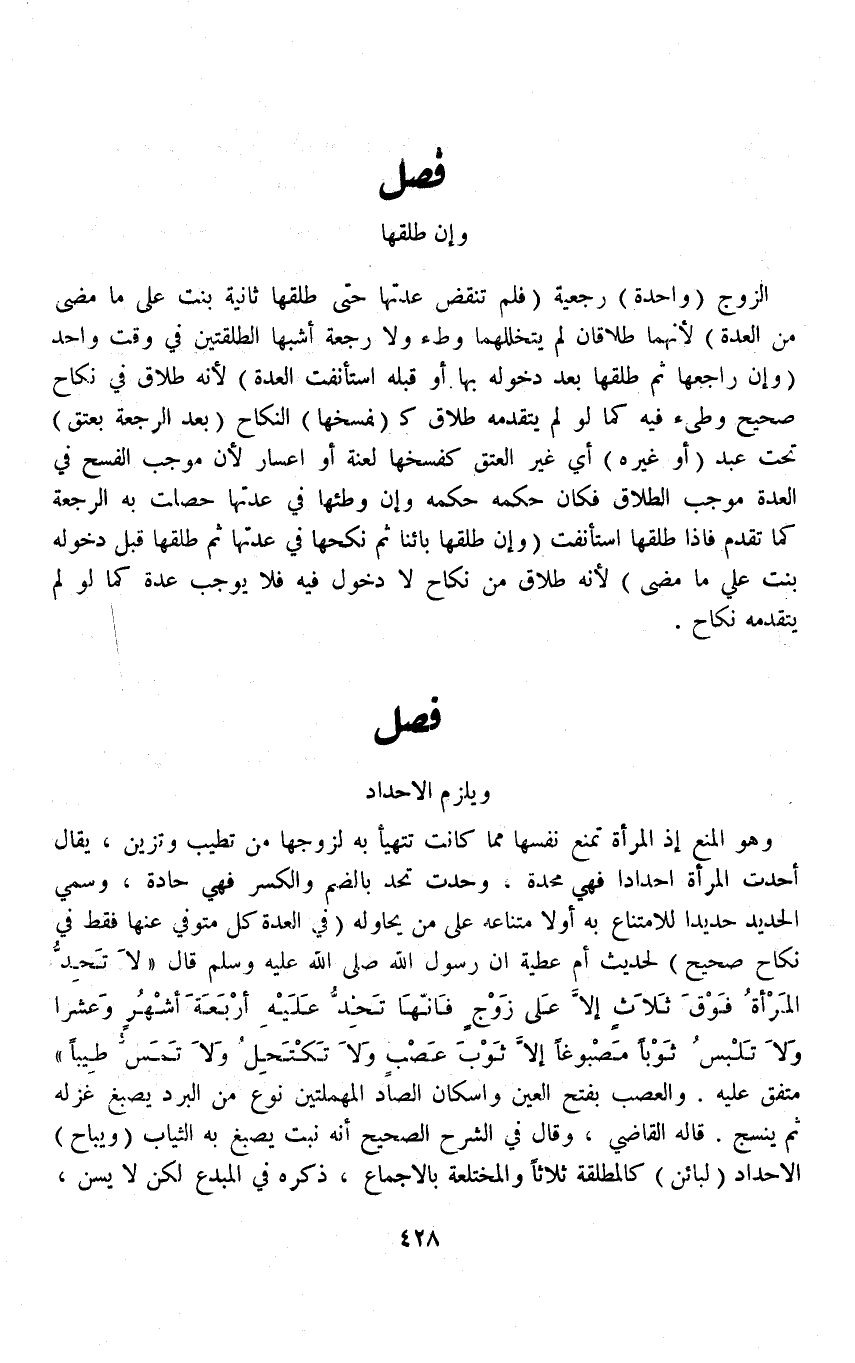 ُ وَهُوَ الْمَنْعُ إذْ الْمَرْأَةُ تَمْنَعُ نَفْسَهَا مِمَّا كَانَتْ تَتَهَيَّأُ بِهِ لِزَوْجِهَا مِنْ تَطَيُّبٍ وَتَزَيُّنٍ، يُقَالُ أَحَدَّتْ الْمَرْأَةُ إحْدَادًا فَهِيَ مُحِدَّةٌ وَحَّدَتْ تَحُدُّ بِالضَّمِّ وَالْكَسْرِ فَهِيَ حَادَّةٌ، وَسُمِّيَ الْحَدِيدُ حَدِيدًا لِلِامْتِنَاعِ بِهِ، أَوْ لِامْتِنَاعِهِ عَلَى مَنْ يُحَاوِلُهُ (فِي الْعِدَّةِ كُلُّ مُتَوَفًّى عَنْهَا فَقَطْ فِي نِكَاحٍ صَحِيحٍ) لِحَدِيثِ أُمّ عَطِيَّةَ أَنَّ رَسُولَ اللَّهِ - صَلَّى اللَّهُ عَلَيْهِ وَسَلَّمَ - قَالَ «لَا تُحِدُّ الْمَرْأَةُ فَوْقَ ثَلَاثٍ إلَّا عَلَى زَوْجٍ فَإِنَّهَا تُحِدُّ عَلَيْهِ أَرْبَعَةَ أَشْهُرٍ وَعَشْرًا وَلَا تَلْبَسُ ثَوْبًا مَصْنُوعًا إلَّا ثَوْبَ عَصْبٍ وَلَا تَكْتَحِلُ وَلَا تَمَسُّ طِيبًا» مُتَّفَقٌ عَلَيْهِ وَالْعَصْبُ بِفَتْحِ الْعَيْنِ وَإِسْكَانِ الصَّادِ الْمُهْمَلَتَيْنِ نَوْعٌ مِنْ الْبُرْدِ يُصْبَغُ غَزْلُهُ ثُمَّ يُنْسَجُ قَالَهُ الْقَاضِي، وَقَالَ فِي الشَّرْحِ الصَّحِيحِ إنَّهُ نَبْتٌ يُصْبَغُ بِهِ الثِّيَابُ.