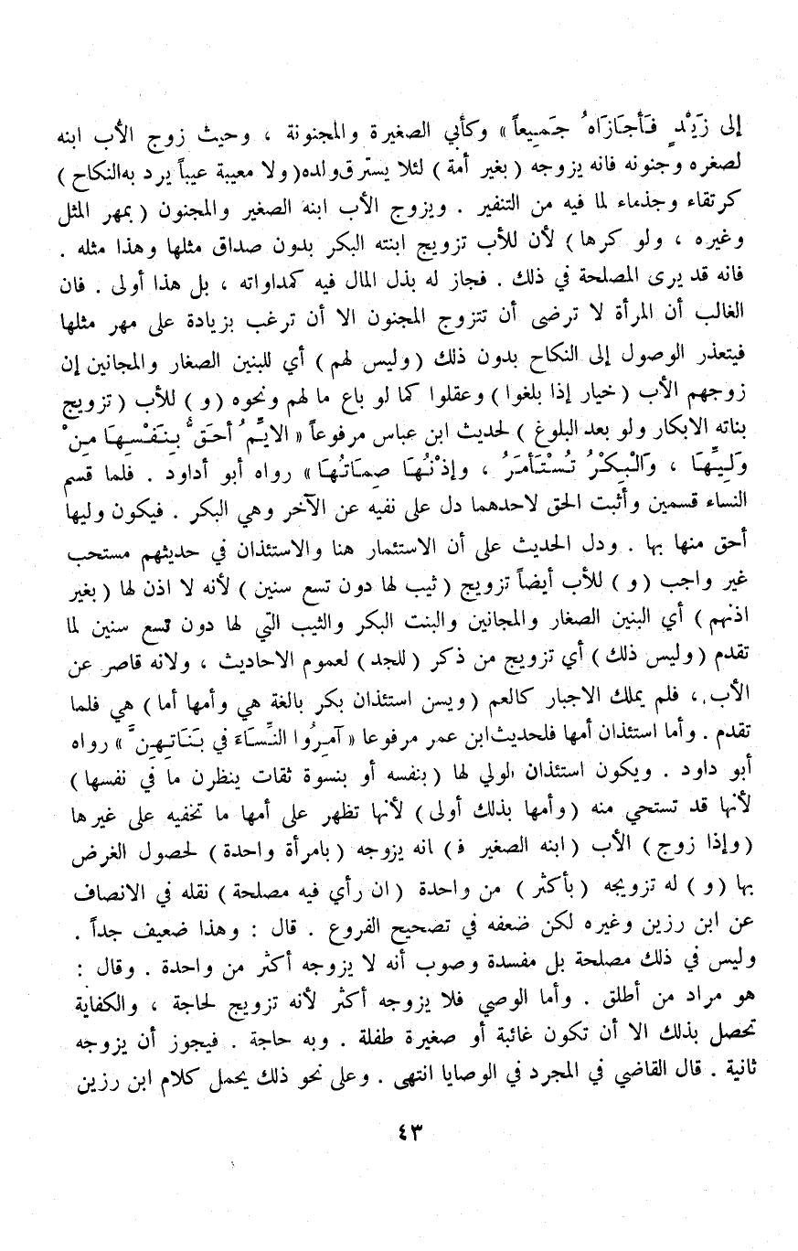 (وَ) لَهُ تَزْوِيجُهُ (بِأَكْثَرَ) مِنْ وَاحِدَةٍ (إنْ رَأَى فِيهِ مَصْلَحَةً) نَقَلَهُ فِي الْإِنْصَافِ عَنْ ابْنِ رَزِينٍ وَغَيْرِهِ لَكِنْ ضَعَّفَهُ فِي تَصْحِيحِ الْفُرُوعِ قَالَ وَهَذَا ضَعِيفٌ جِدًّا وَلَيْسَ فِي ذَلِكَ مَصْلَحَةٌ بَلْ مَفْسَدَةٌ وَصَوَّبَ أَنَّهُ لَا يُزَوِّجُهُ أَكْثَرَ مِنْ وَاحِدَةٍ وَقَالَ هُوَ مُرَادُ مَنْ أَطْلَقَ وَأَمَّا الْوَصِيُّ فَلَا يُزَوِّجُهُ أَكْثَرَ لِأَنَّهُ تَزْوِيجٌ لِحَاجَةٍ، وَالْكِفَايَةُ تَحْصُلُ بِذَلِكَ إلَّا أَنْ تَكُونَ غَائِبَةً أَوْ صَغِيرَةً طِفْلَةً وَبِهِ حَاجَةٌ فَيَجُوزُ أَنْ يُزَوِّجَهُ ثَانِيَةً قَالَ الْقَاضِي فِي الْمُجَرَّدِ فِي الْوَصَايَا انْتَهَى وَعَلَى نَحْوِ ذَلِكَ يُحْمَلُ كَلَامُ ابْنِ رَزِينٍ