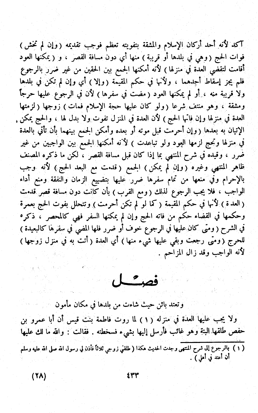 آكَدُ؛ لِأَنَّهُ أَحَدُ أَرْكَانِ الْإِسْلَامِ، وَالْمَشَقَّةُ بِتَفْوِيتِهِ تَعْظُمُ فَوَجَبَ تَقْدِيمُهُ (وَإِنْ لَمْ تَخْشَ) فَوَاتَ الْحَجِّ (وَهِيَ فِي بَلَدِهَا أَوْ قَرِيبَةٌ مِنْهَا) أَيْ دُونَ مَسَافَةِ الْقَصْرِ، وَ (يُمْكِنُهَا الْعَوْدُ أَقَامَتْ لِتَقْضِيَ الْعِدَّةَ فِي مَنْزِلِهَا) لِأَنَّهُ أَمْكَنَهَا الْجَمْعُ بَيْنَ الْحَقَّيْنِ مِنْ غَيْرِ ضَرَرٍ بِالرُّجُوعِ فَلَمْ يَجُزْ إسْقَاطُ أَحَدِهِمَا وَلِأَنَّهَا فِي حُكْمِ الْمُقِيمَةِ (وَإِلَّا) أَيْ وَإِنْ لَمْ تَكُنْ فِي بَلَدِهَا وَلَا قَرِيبَةً مِنْهُ أَوْ لَمْ يُمْكِنْهَا الْعَوْدُ (مَضَتْ فِي سَفَرِهَا) لِأَنَّ فِي الرُّجُوعِ عَلَيْهَا حَرَجًا وَمَشَقَّةً، وَهُوَ مُنْتَفٍ شَرْعًا (وَلَوْ كَانَ عَلَيْهَا حَجَّةُ الْإِسْلَامِ فَمَاتَ) زَوْجُهَا (لَزِمَتْهَا الْعِدَّةُ فِي مَنْزِلِهَا وَإِنْ فَاتَهَا الْحَجُّ) لِأَنَّ الْعِدَّةَ فِي الْمَنْزِلِ تَفُوتُ وَلَا بَدَلَ لَهَا، وَالْحَجُّ يُمْكِنُ الْإِتْيَانَ بِهِ بَعْدَهَا.