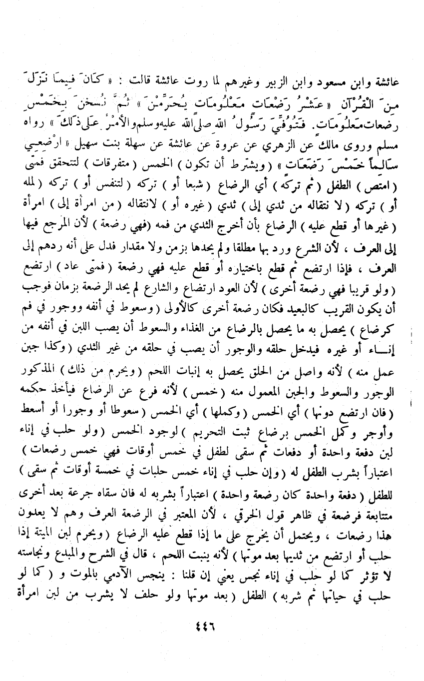 عَائِشَةَ وَابْنِ مَسْعُودٍ وَابْنِ الزُّبَيْرِ وَغَيْرِهِمْ لِمَا رَوَتْ عَائِشَةُ قَالَتْ: " كَانَ فِيمَا نَزَلَ مِنْ الْقُرْآنِ عَشْرُ رَضْعَاتٍ مَعْلُومَاتٍ يُحَرِّمْنَ ثُمَّ نُسْخِنَ بِخَمْسِ رَضَعَاتٍ مَعْلُومَاتٍ فَتُوُفِّيَ رَسُولُ اللَّهِ - صَلَّى اللَّهُ عَلَيْهِ وَسَلَّمَ - وَالْأَمْرُ عَلَى ذَلِكَ " رَوَاهُ مُسْلِمٌ.