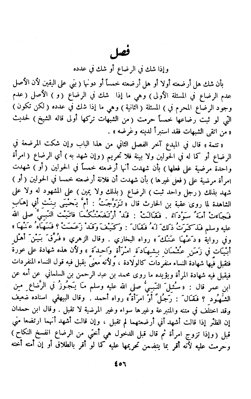 (وَ) الْأَصْلُ (عَدَمُ وُجُودِ الرَّضَاعِ الْمُحَرِّمِ فِي) الْمَسْأَلَةِ (الثَّانِيَةِ) وَهِيَ مَا إذَا شَكَّ فِي عَدَدِهِ (لَكِنْ تَكُونُ) الَّتِي لَوْ ثَبَتَ رَضَاعُهَا خَمْسًا حُرِّمَتْ (مِنْ الشُّبُهَاتِ تَرْكَهَا أَوْلَى قَالَهُ الشَّيْخُ) لِحَدِيثٍ «مَنْ اتَّقَى الشُّبُهَاتِ فَقَدْ اسْتَبْرَأَ لِدِينِهِ وَعِرْضِهِ» تَتِمَّةٌ " قَالَ فِي الْمُبْدِعِ آخَرَ الْفَصْلِ الثَّانِي مِنْ هَذَا الْبَابِ وَإِنْ شَكَّتْ الْمُرْضِعَةُ فِي الرَّضَاعِ أَوْ كَمَالِهِ فِي الْحَوْلَيْنِ وَلَا بَيِّنَةٌ فَلَا تَحْرِيمَ.