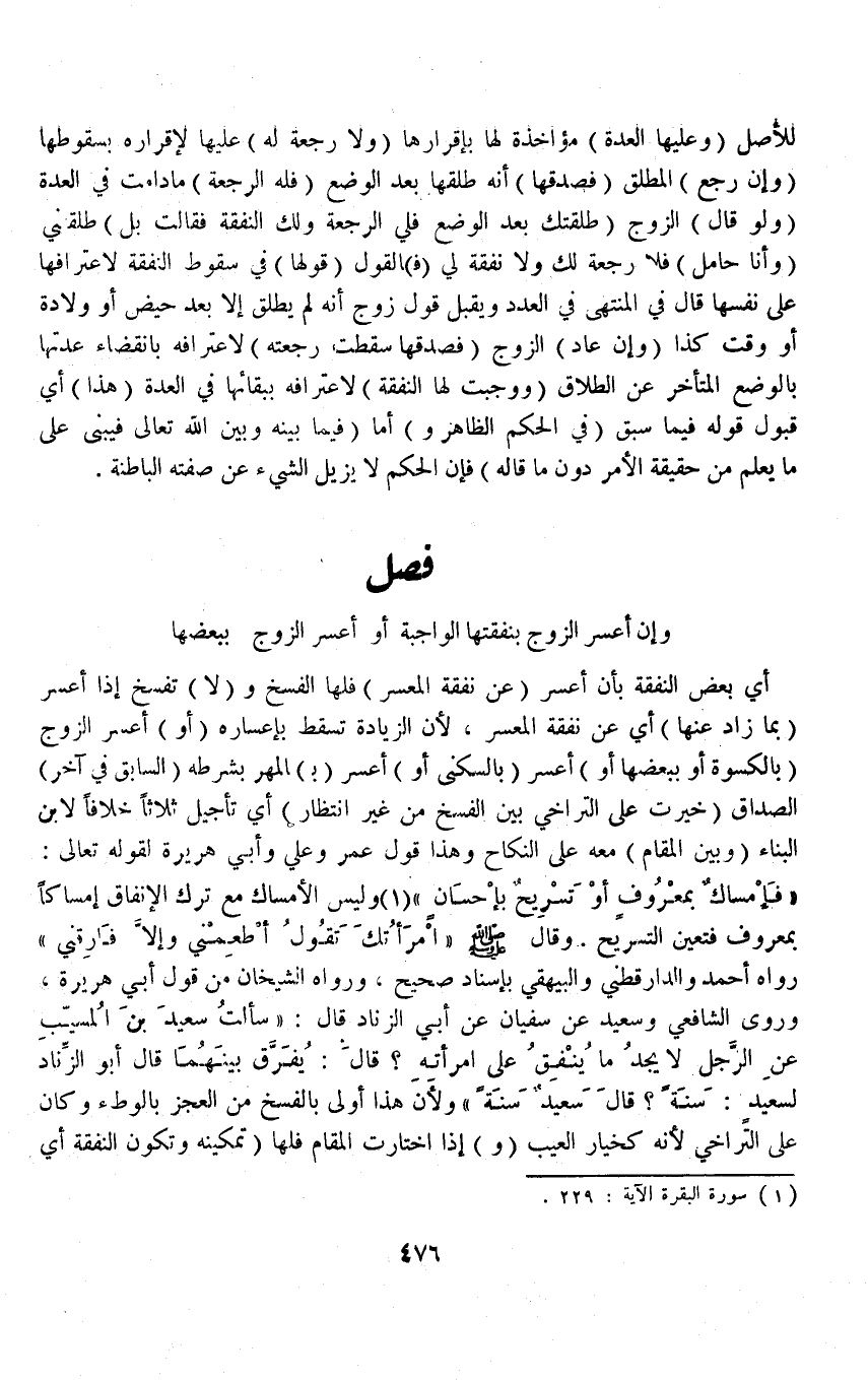 (فَصْلٌ وَإِنْ أَعْسَرَ الزَّوْجُ بِنَفَقَتِهَا) الْوَاجِبَةِ (أَوْ) أَعْسَرَ الزَّوْجُ (بِبَعْضِهَا) أَيْ بَعْضِ النَّفَقَةِ بِأَنْ أَعْسَرَ (عَنْ نَفَقَةِ الْمُعْسِرِ) فَلَهَا الْفَسْخُ وَ (لَا) تَفْسَخُ إذَا أَعْسَرَ (بِمَا زَادَ عَنْهَا) أَيْ عَنْ نَفَقَةِ الْمُعْسِرِ، لِأَنَّ الزِّيَادَةَ تَسْقُطُ بِإِعْسَارِهِ (أَوْ) أَعْسَرَ الزَّوْجُ (بِالْكُسْوَةِ أَوْ بِبَعْضِهَا أَوْ) أَعْسَرَ (بِالسُّكْنَى أَوْ) أَعْسَرَ (بِ) الْمَهْرِ (بِشَرْطِهِ وَتَقَدَّمَ) السَّابِقُ فِي آخِرِ الصَّدَاقِ (خُيِّرَتْ عَلَى التَّرَاخِي بَيْنَ الْفَسْخِ مِنْ غَيْرِ انْتِظَارٍ) أَيْ تَأْجِيلِ ثَلَاثًا خِلَافًا لِابْنِ الْبَنَّاءِ (وَبَيْنَ الْمَقَامِ) مَعَهُ عَلَى النِّكَاحِ وَهَذَا قَوْلُ عُمَرَ وَعَلِيٍّ وَأَبِي هُرَيْرَةَ لِقَوْلِهِ تَعَالَى: {فَإِمْسَاكٌ بِمَعْرُوفٍ أَوْ تَسْرِيحٌ بِإِحْسَانٍ} [البقرة: ٢٢٩] وَلَيْسَ الْإِمْسَاكُ مَعَ تَرْكِ الْإِنْفَاقِ إمْسَاكًا بِمَعْرُوفٍ فَتَعَيَّنَ التَّسْرِيحُ «وَقَالَ - صَلَّى اللَّهُ عَلَيْهِ وَسَلَّمَ - امْرَأَتُكَ تَقُولُ أَطْعِمْنِي وَإِلَّا فَارِقْنِي» رَوَاهُ أَحْمَدُ وَالدَّارَقُطْنِيّ وَالْبَيْهَقِيُّ بِإِسْنَادٍ صَحِيحٍ وَرَوَاهُ الشَّيْخَانِ مِنْ قَوْلِ أَبِي هُرَيْرَةَ.