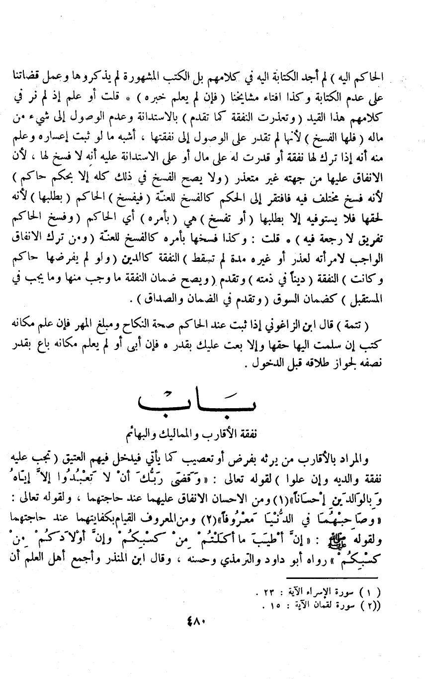 (بَاب نَفَقَةُ الْأَقَارِبِ وَالْمَمَالِيكِ وَالْبَهَائِمِ) وَالْمُرَادُ بِالْأَقَارِبِ مِنْ يَرِثُهُ بِفَرْضٍ أَوْ تَعْصِيبٍ كَمَا يَأْتِي فَيَدْخُلُ فِيهِمْ الْعَتِيقُ (تَجِبُ عَلَيْهِ نَفَقَةُ وَالِدَيْهِ وَإِنْ عَلَوَا) لِقَوْلِهِ تَعَالَى: {وَقَضَى رَبُّكَ أَلا تَعْبُدُوا إِلا إِيَّاهُ وَبِالْوَالِدَيْنِ إِحْسَانًا} [الإسراء: ٢٣] وَمِنْ الْإِحْسَانِ الْإِنْفَاقُ عَلَيْهِمَا عِنْدَ حَاجَتِهِمَا، وَلِقَوْلِهِ تَعَالَى: {وَصَاحِبْهُمَا فِي الدُّنْيَا مَعْرُوفًا} [لقمان: ١٥] وَمِنْ الْمَعْرُوفِ الْقِيَامُ بِكِفَايَتِهِمَا عِنْدَ حَاجَتِهِمَا وَلِقَوْلِهِ - صَلَّى اللَّهُ عَلَيْهِ وَسَلَّمَ -: «إنَّ أَطْيَبَ مَا أَكَلْتُمْ مِنْ كَسْبِكُمْ وَإِنَّ أَوْلَادَكُمْ مِنْ كَسْبِكُمْ» رَوَاهُ أَبُو دَاوُد وَالتِّرْمِذِيُّ وَحَسَّنَهُ، وَقَالَ ابْنُ الْمُنْذِرِ وَأَجْمَعَ أَهْلُ الْعِلْمِ